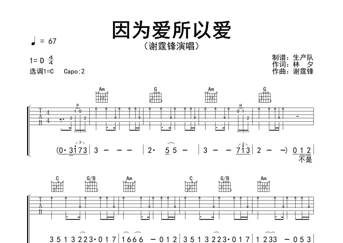 《因为爱所以爱》是谢霆锋演唱的一首歌曲,精编完美版,拍号为4/4拍,歌曲速度为每分钟67拍,歌曲原调为D调,但由于原调指法比较难,为了方便弹奏,本吉他谱采用的是C调指法编配,变调夹2品弹奏即为原调,当然也可以根据自己的音域改变变调夹位置,或者通过改变和弦调性,以方便自己弹奏,这份吉他谱共有三张高清图谱,图谱由 @生产队 编配上传,图谱使用六线谱编配,包含吉他和弦指法、简谱以及歌词部分,使用这份因为爱所以爱吉他谱,可以让你更加方便地掌握这首歌曲的弹唱技巧,快来尝试吧。《因为爱所以爱》由林夕填词,Davy Chan编曲,谢霆锋谱曲并演唱的一首国语歌曲。本吉他谱根据原版C调指法编配,完整的前奏、间奏、尾奏,原版扫弦编配编配,怀旧经典!。