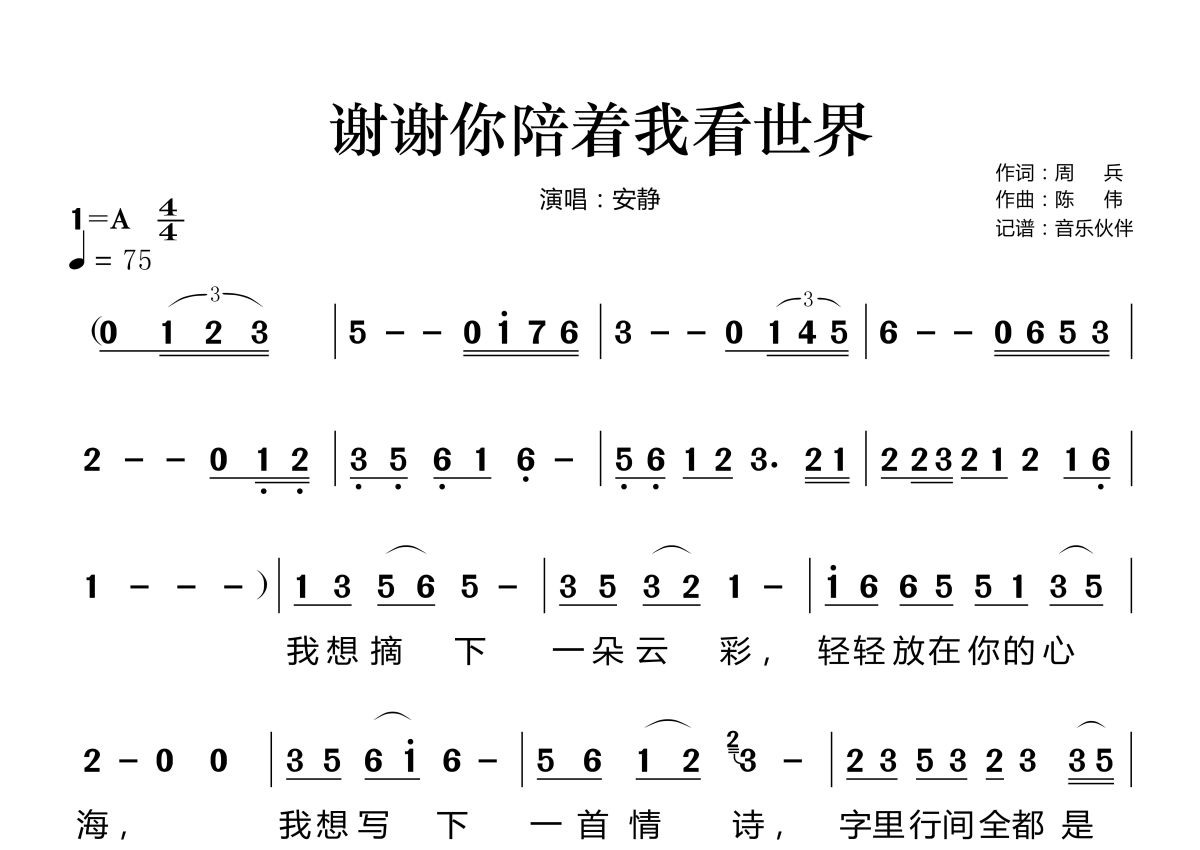 《谢谢你陪着我看世界》是安静演唱的一首歌曲,这份简谱共有两张高清图谱,图谱由 @音乐伙伴 编配上传。
