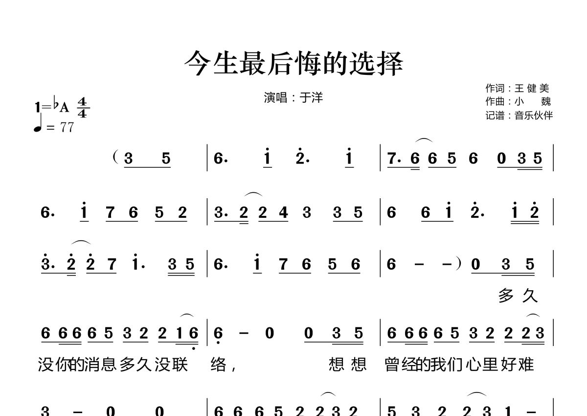 《今生最后悔的选择》是于洋演唱的一首歌曲,拍号为4/4拍,歌曲速度为每分钟77拍,这份简谱共有两张高清图谱,图谱由 @音乐伙伴 编配上传。