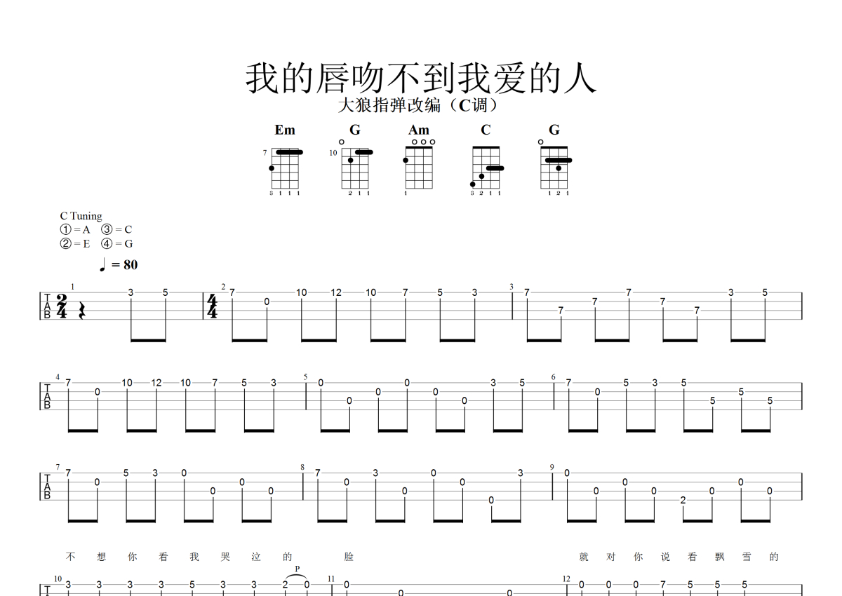《我的唇吻不到我爱的人》是王奕心演唱的一首歌曲,指弹独奏,拍号为4/4拍,歌曲速度为每分钟80拍,歌曲原调为C调,本尤克里里谱采用的是C调指法编配,演奏时不需要使用变调夹即为原调,这份尤克里里谱共有两张高清图谱,图谱由 @大狼指弹 编配上传,图谱使用四线谱编配,曲谱配备了相关的音频提供试听,使用这份我的唇吻不到我爱的人尤克里里谱,可以让你更加方便地掌握这首歌曲的演奏技巧,快来尝试吧。