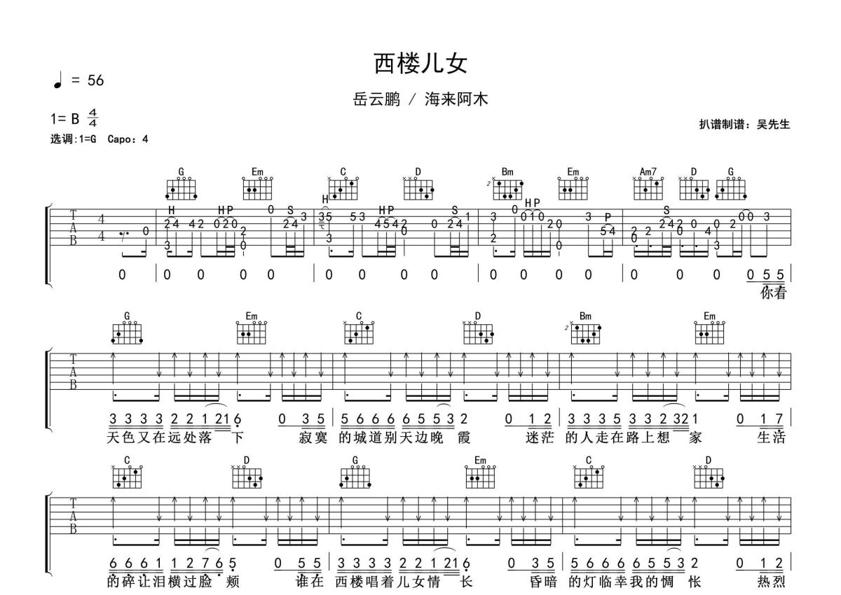 《西楼儿女》是岳云鹏演唱的一首歌曲,拍号为4/4拍,歌曲速度为每分钟56拍,歌曲原调为B调,但由于原调指法比较难,为了方便弹奏,本吉他谱采用的是G调指法编配,变调夹4品弹奏即为原调,当然也可以根据自己的音域改变变调夹位置,或者通过改变和弦调性,以方便自己弹奏,这份吉他谱共有两张高清图谱,图谱由 @吴先生TAB 编配上传,图谱使用六线谱编配,包含吉他和弦指法、简谱以及歌词部分,曲谱配备了相关的音频提供试听,使用这份西楼儿女吉他谱,可以让你更加方便地掌握这首歌曲的弹唱技巧,快来尝试吧。