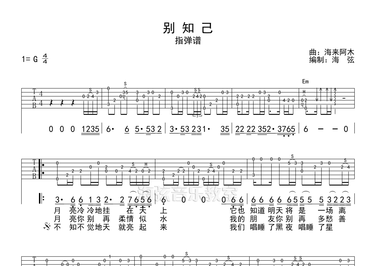 《别知己》是海来阿木演唱的一首歌曲,拍号为4/4拍,歌曲原调为G调,本吉他谱采用的是G调指法编配,演奏时不需要使用变调夹即为原调,这份吉他谱共有两张高清图谱,图谱由 @海弦 编配上传,图谱使用六线谱编配,使用这份别知己吉他谱,可以让你更加方便地掌握这首歌曲的演奏技巧,快来尝试吧。海来阿木《别知己》,一首直击心灵的作品,满满的离别相思之情。我的朋友你别再多愁善感,昨天已经过去,所有的伤心和烦恼已离去,你要相信明天的天空,会更蔚蓝! 别知己吉他谱,来自@海弦吉他教室编配指弹谱,带前奏间奏完整版,本谱采用G调和弦指法编配,节奏为4/4拍,速度为70-80拍每分钟,难度★★☆。