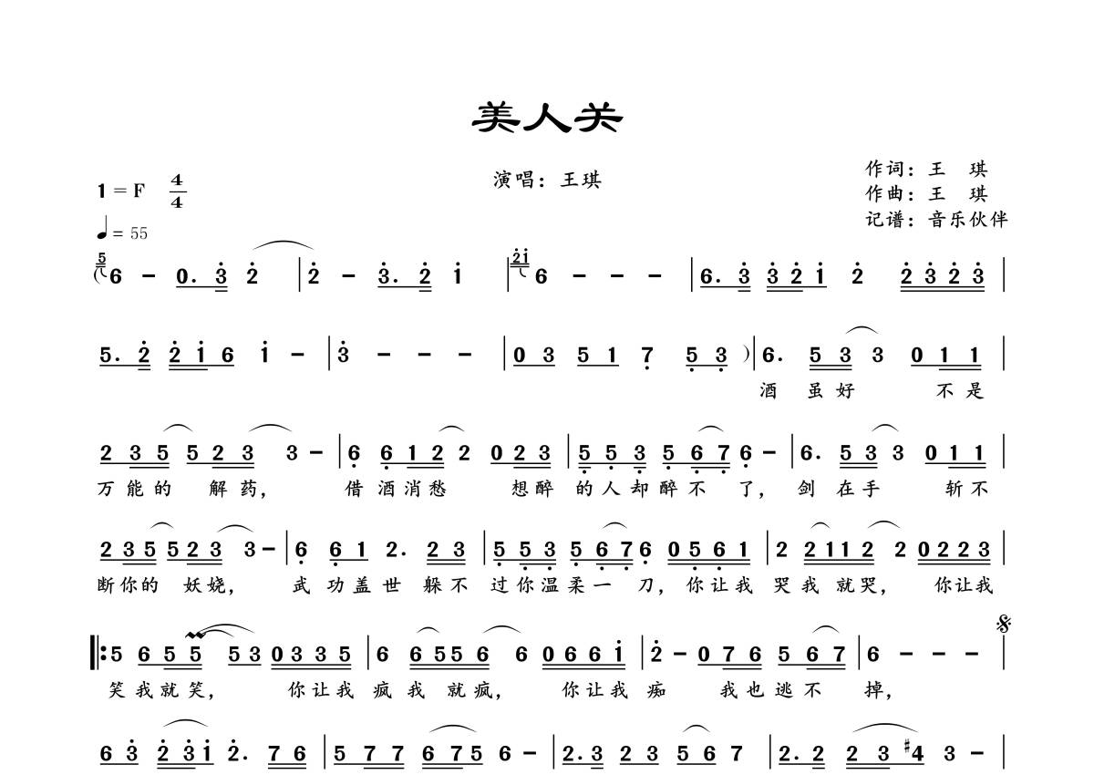 《美人关》是王琪演唱的一首歌曲,拍号为4/4拍,歌曲速度为每分钟55拍,这份简谱共有一张高清图谱,图谱由 @音乐伙伴 编配上传。