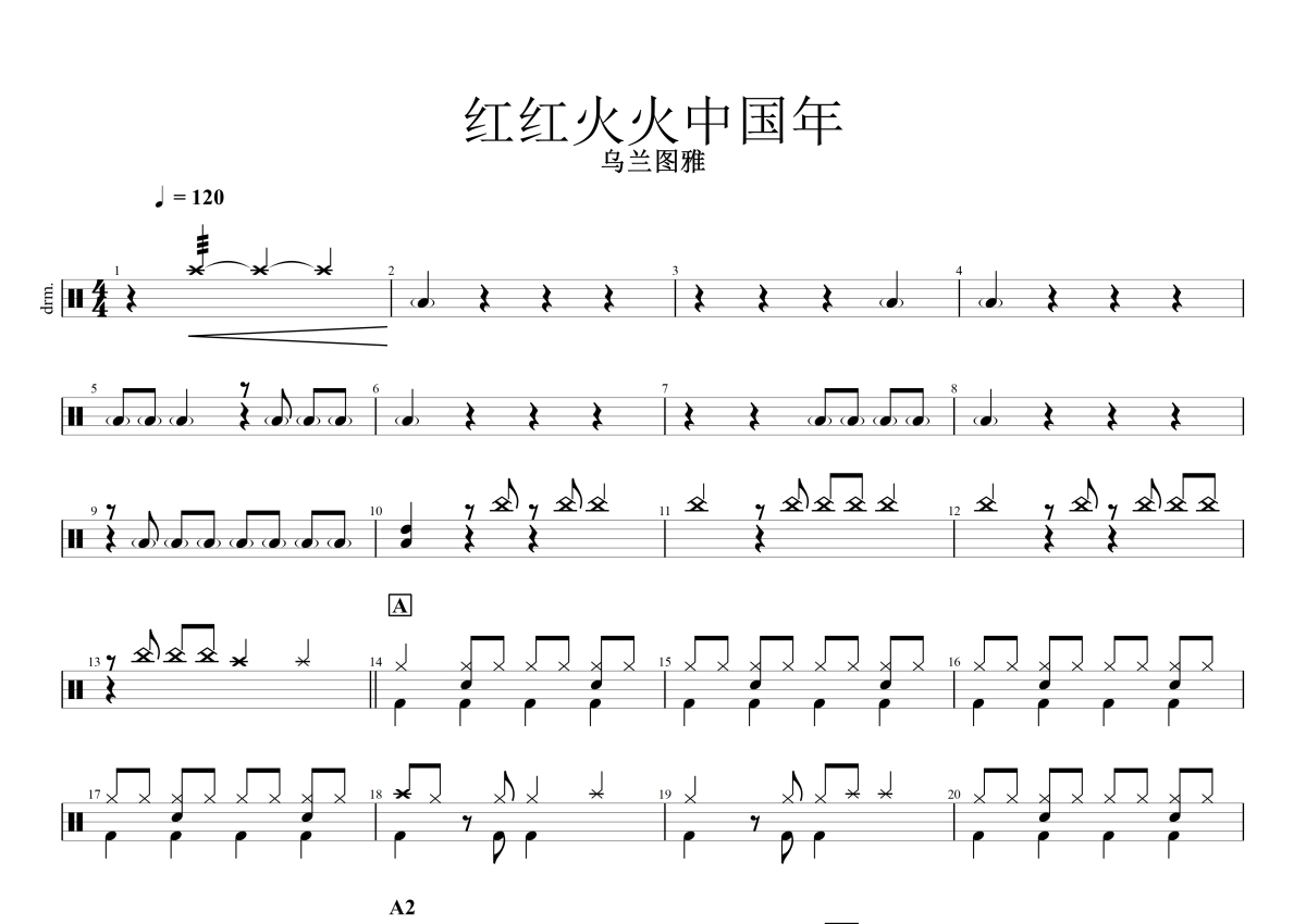 《红红火火中国年》是乌兰图雅演唱的一首歌曲,拍号为4/4拍,歌曲速度为每分钟120拍,这份鼓谱共有三张高清图谱,图谱由 @打鼓老被骂 编配上传,图谱使用五线谱编配,使用这份红红火火中国年架子鼓谱,你将能够轻松地敲打出这首乌兰图雅的红红火火中国年,快来尝试吧。