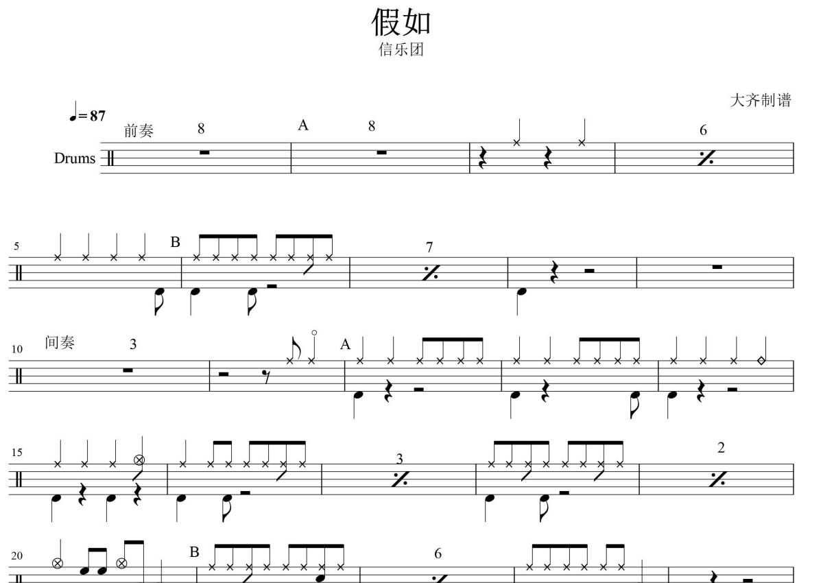 《假如》是信乐团演唱的一首歌曲,拍号为4/4拍,歌曲速度为每分钟87拍,这份鼓谱共有一张高清图谱,图谱由 @大齐 编配上传,图谱使用五线谱编配,使用这份假如架子鼓谱,你将能够轻松地敲打出这首信乐团的假如,快来尝试吧。