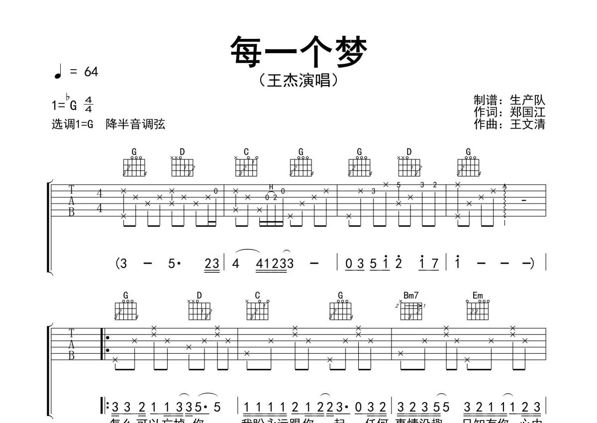 《每一个梦》是王杰演唱的一首歌曲,精编完美版,拍号为4/4拍,歌曲速度为每分钟64拍,歌曲原调为Gb调,但由于原调指法比较难,为了方便弹奏,本吉他谱采用的是G调指法编配,降半音调弦弹奏即为原调,当然也可以根据自己的音域决定是否调弦,这份吉他谱共有三张高清图谱,图谱由 @生产队 编配上传,图谱使用六线谱编配,包含吉他和弦指法、简谱以及歌词部分,使用这份每一个梦吉他谱,可以让你更加方便地掌握这首歌曲的弹唱技巧,快来尝试吧。《每一个梦》是王杰演唱的一首粤语歌曲,由香港著名填词人郑国江作词,台湾著名音乐人王文清作曲,陈志远编曲,收录在1989年《故事的角色》专辑中。本吉他谱根据原版G调指法编配,精准的前奏、间奏和solo编配,怀旧粤语经典!。