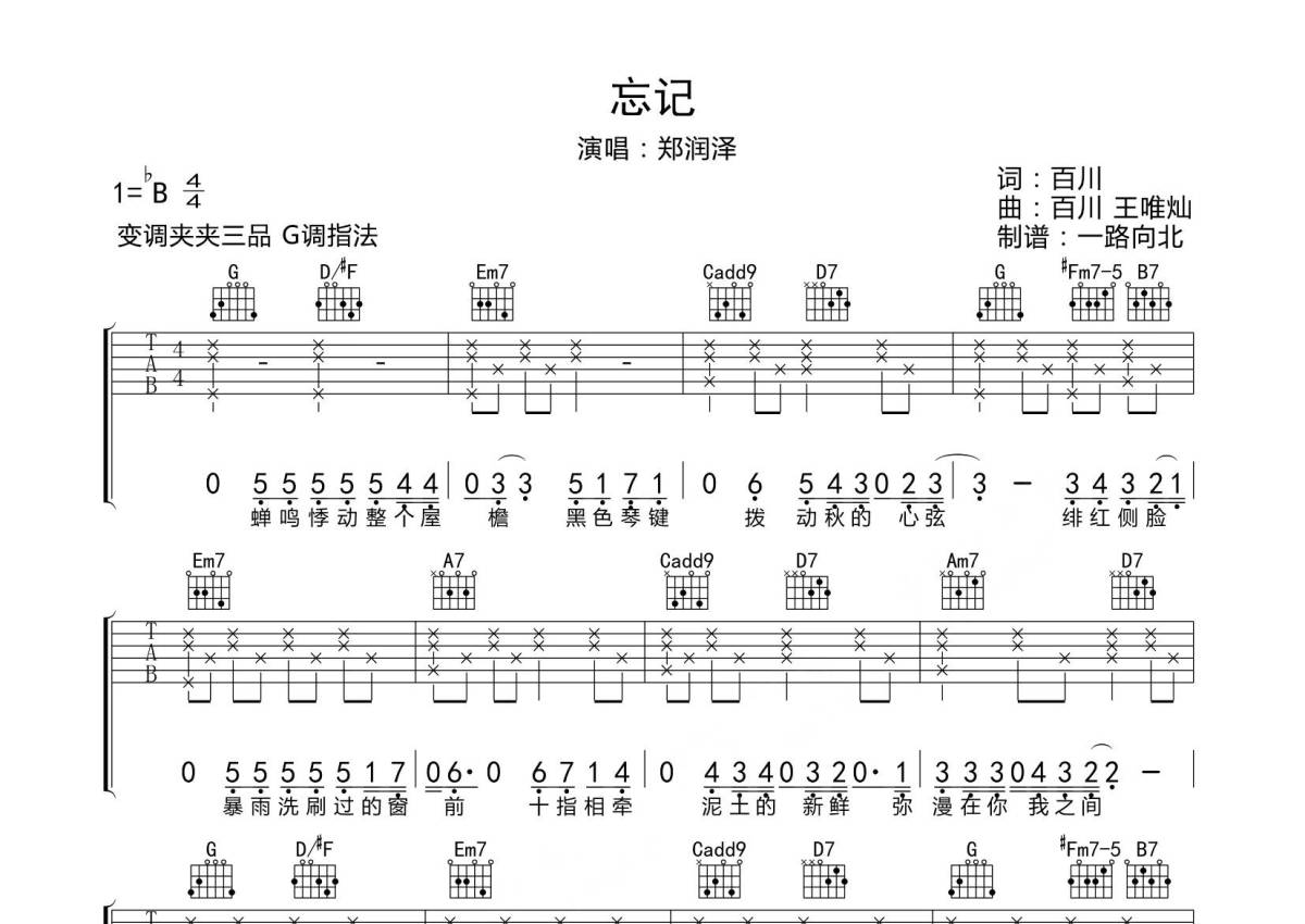 郑润泽《忘记》吉他谱 - G调弹唱六线谱