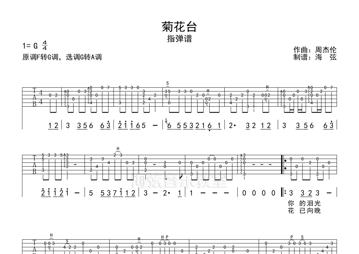 《菊花台》是周杰伦演唱的一首歌曲,歌曲原调为F调,但由于原调指法比较难,为了方便弹奏,本吉他谱采用的是G调指法编配,降半音调弦弹奏即为原调,当然也可以根据自己的音域决定是否调弦,这份吉他谱共有两张高清图谱,图谱由 @海弦 编配上传,图谱使用六线谱编配,使用这份菊花台吉他谱,可以让你更加方便地掌握这首歌曲的演奏技巧,快来尝试吧。菊花台指弹独奏吉他谱,来自@海弦编配扒谱,采用G转A调和弦指法演奏,原调为F转G调,降全音调弦则为原调,用标准调弦或降半音调弦也可以,根据个人喜好选择,演奏难度为中等。