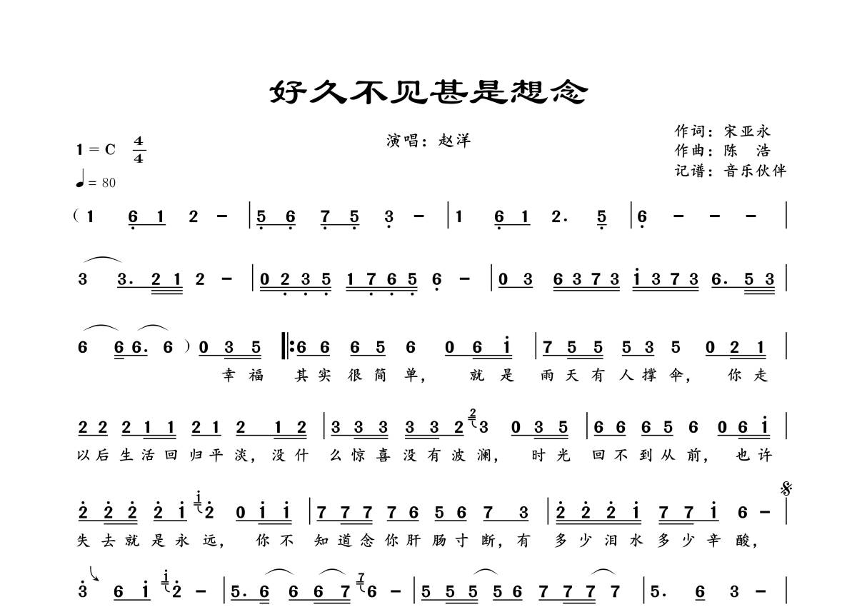 《好久不见甚是想念》是赵洋演唱的一首歌曲,拍号为4/4拍,歌曲速度为每分钟80拍,这份简谱共有一张高清图谱,图谱由 @音乐伙伴 编配上传。