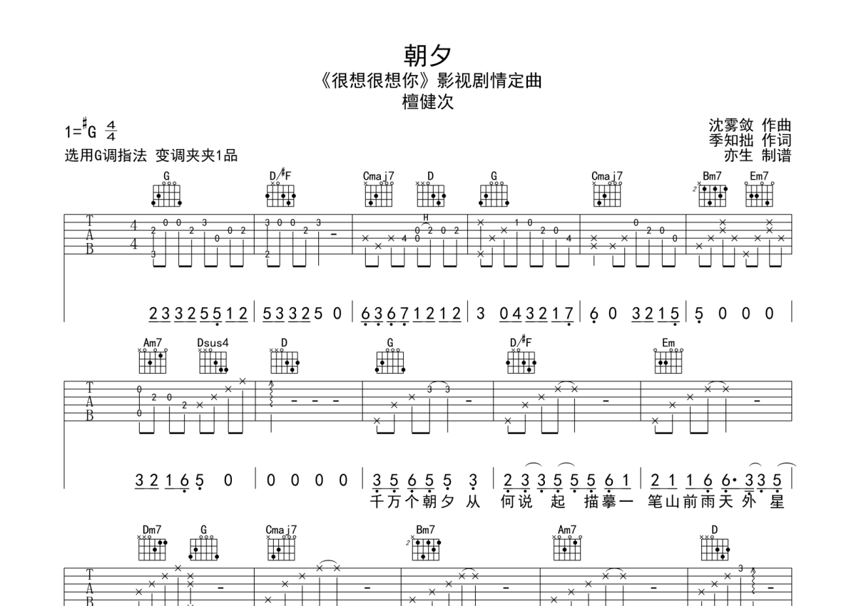 檀健次《朝夕》吉他谱 - G调弹唱六线谱