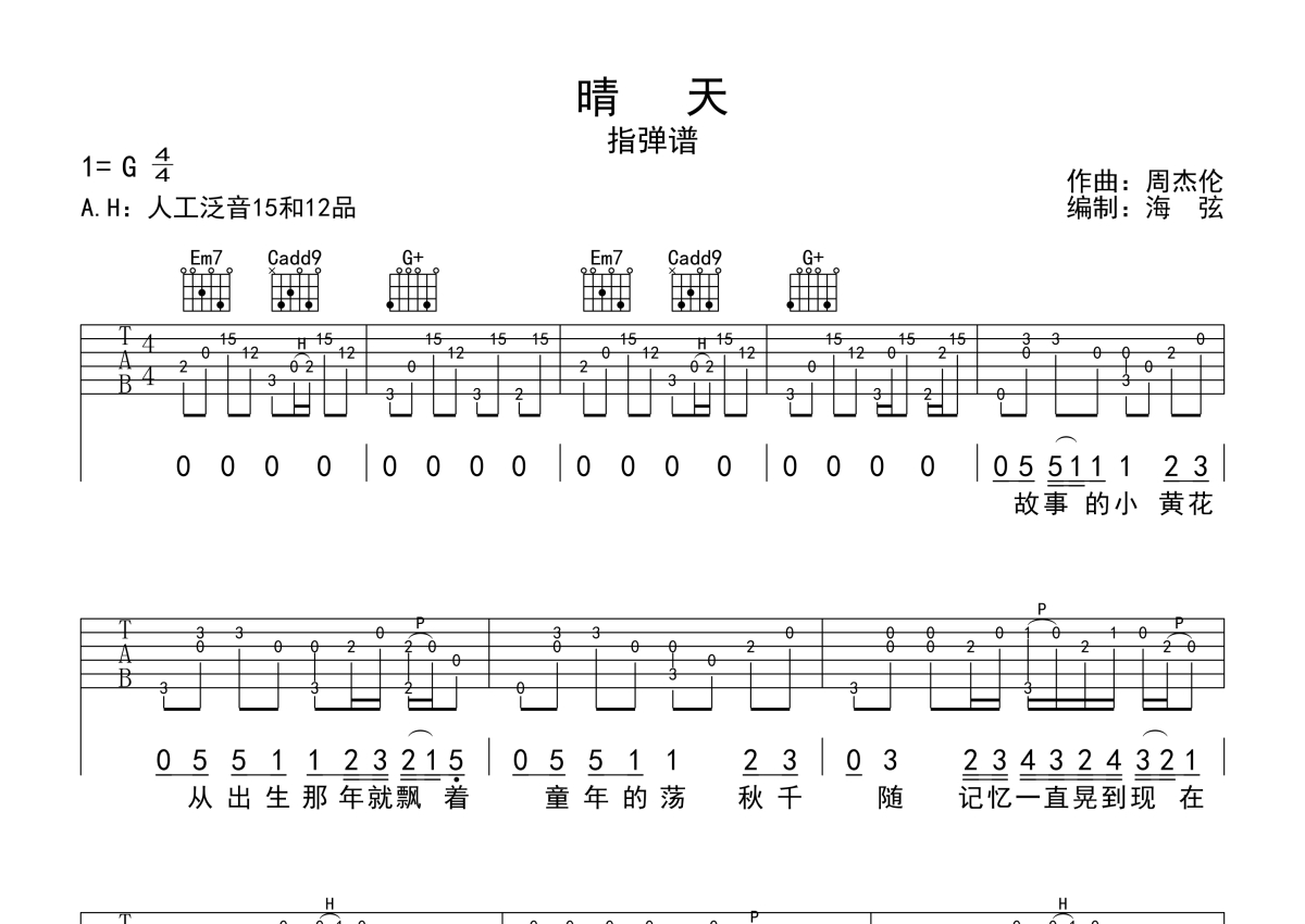 《晴天》是周杰伦演唱的一首歌曲,拍号为4/4拍,歌曲原调为G调,本吉他谱采用的是G调指法编配,演奏时不需要使用变调夹即为原调,这份吉他谱共有两张高清图谱,图谱由 @海弦 编配上传,图谱使用六线谱编配,使用这份晴天吉他谱,可以让你更加方便地掌握这首歌曲的演奏技巧,快来尝试吧。晴天指弹吉他谱,来自海弦编配扒谱,采用G调和弦指法演奏,演奏速度大约每分钟80拍,演奏难度为中等。