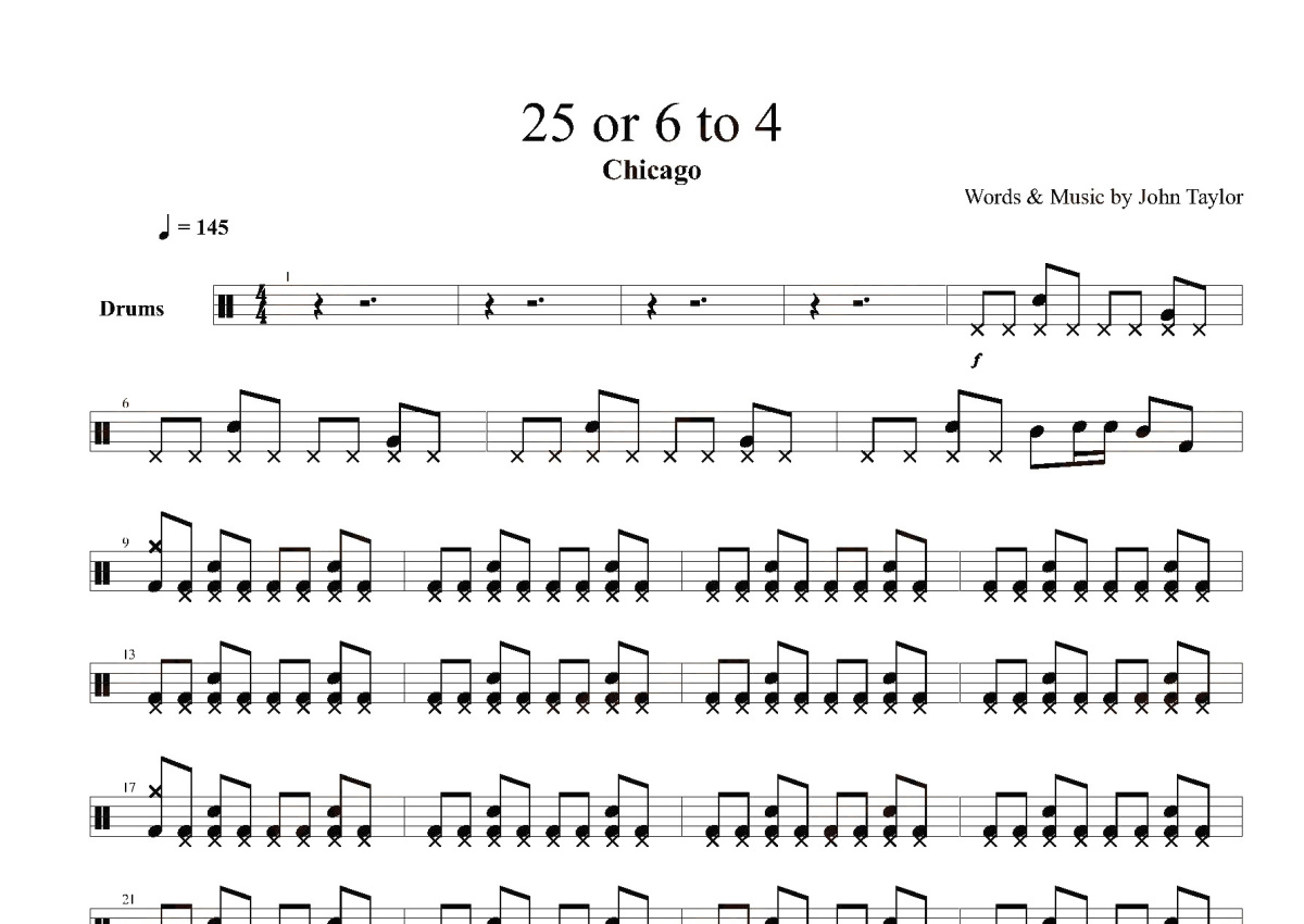 《25 Or 6 To 4》是Chicago演唱的一首歌曲,这份鼓谱共有四张高清图谱,图谱由 @打鼓谱 编配上传,图谱使用五线谱编配,使用这份25 Or 6 To 4架子鼓谱,你将能够轻松地敲打出这首Chicago的25 Or 6 To 4,快来尝试吧。《25 Or 6 To 4》现场版。