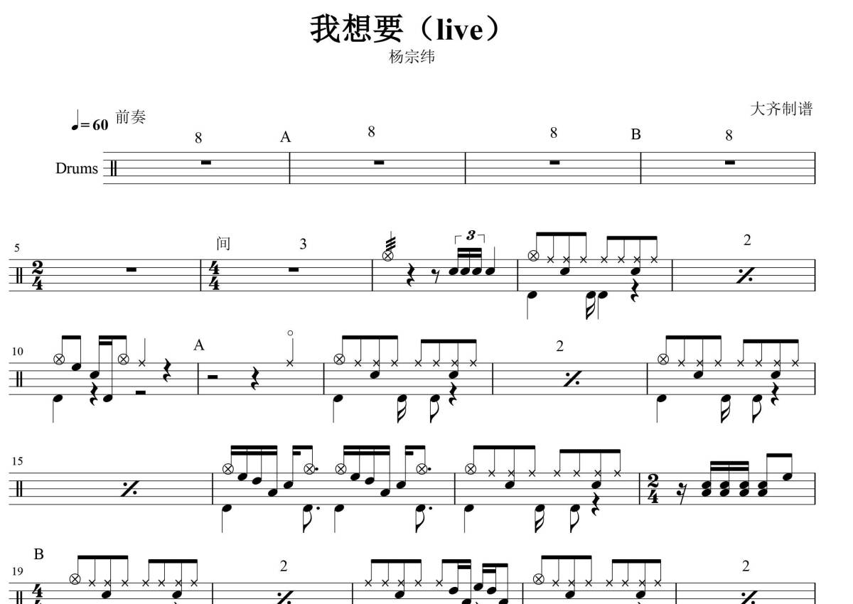 《我想要》是杨宗纬演唱的一首歌曲,live,拍号为4/4拍,歌曲速度为每分钟60拍,这份鼓谱共有一张高清图谱,图谱由 @大齐 编配上传,图谱使用五线谱编配,使用这份我想要架子鼓谱,你将能够轻松地敲打出这首杨宗纬的我想要,快来尝试吧。