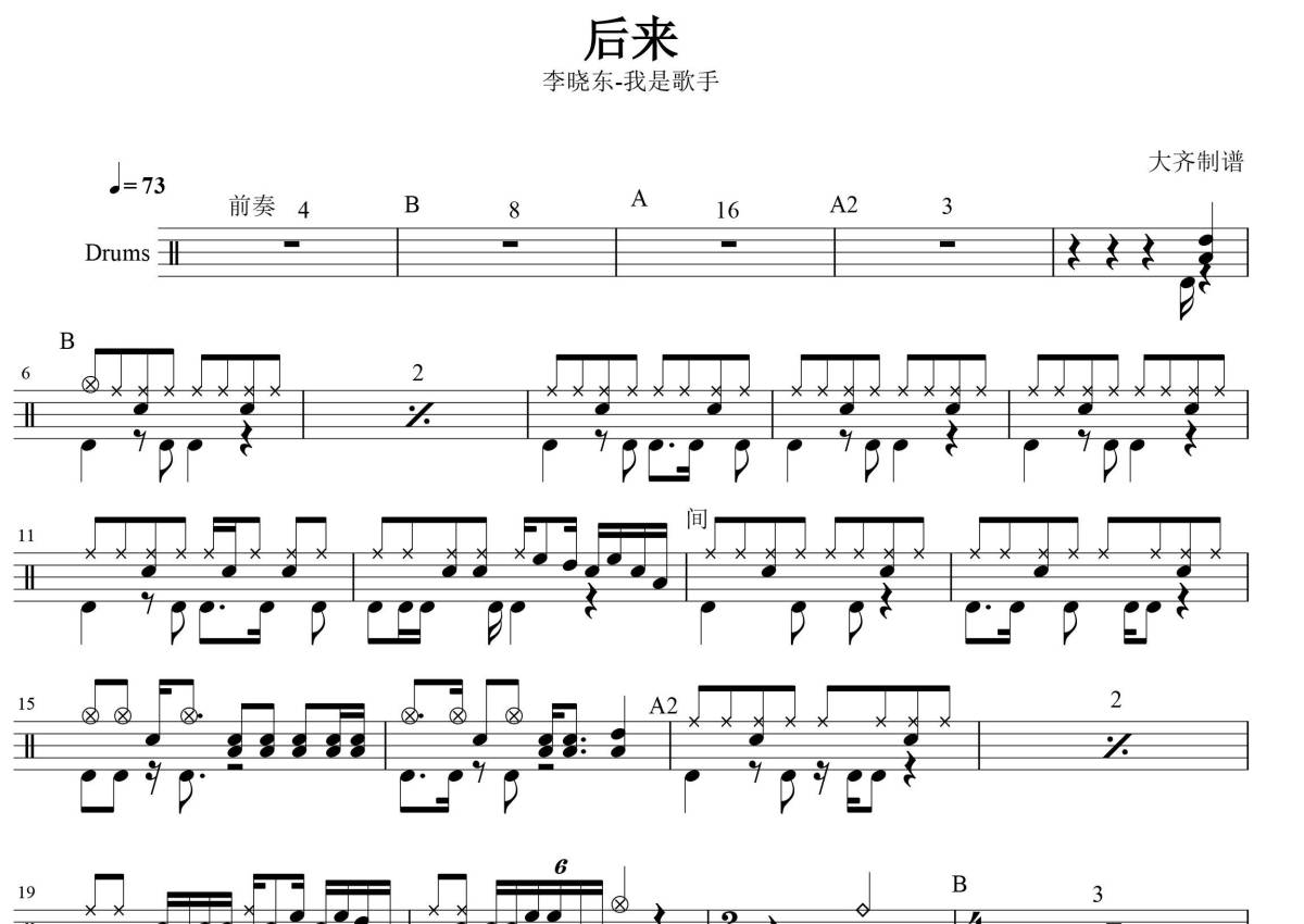 《后来》是李晓东演唱的一首歌曲,拍号为4/4拍,歌曲速度为每分钟73拍,这份鼓谱共有一张高清图谱,图谱由 @大齐 编配上传,图谱使用五线谱编配,使用这份后来架子鼓谱,你将能够轻松地敲打出这首李晓东的后来,快来尝试吧。