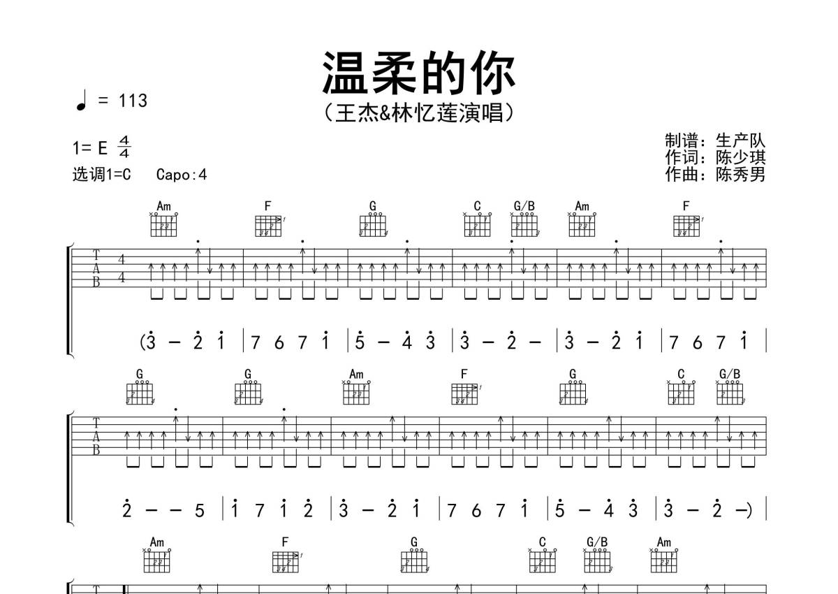 《温柔的你》是王杰、林忆莲演唱的一首歌曲,精编完美版,拍号为4/4拍,歌曲速度为每分钟113拍,歌曲原调为E调,但由于原调指法比较难,为了方便弹奏,本吉他谱采用的是C调指法编配,变调夹4品弹奏即为原调,当然也可以根据自己的音域改变变调夹位置,或者通过改变和弦调性,以方便自己弹奏,这份吉他谱共有三张高清图谱,图谱由 @生产队 编配上传,图谱使用六线谱编配,包含吉他和弦指法、简谱以及歌词部分,使用这份温柔的你吉他谱,可以让你更加方便地掌握这首歌曲的弹唱技巧,快来尝试吧。《温柔的你》是一首由陈少琪作词、陈秀男作曲、陈志远编曲,王杰、林忆莲合唱的歌曲,收录在王杰的首张粤语专辑《故事的角色》中。本吉他谱根据原版C调指法编配,精准的前奏、间奏及solo编配,扫弦节奏,怀旧经典!。