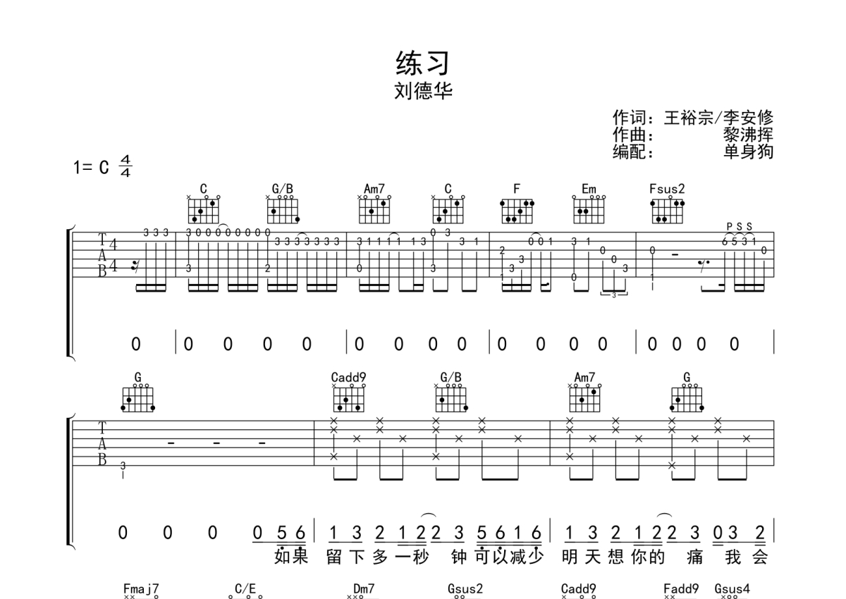 《练习》是刘德华演唱的一首歌曲,拍号为4/4拍,歌曲原调为C调,本吉他谱采用的是C调指法编配,演奏时不需要使用变调夹即为原调,这份吉他谱共有四张高清图谱,图谱由 @单身狗 编配上传,图谱使用六线谱编配,包含吉他和弦指法、简谱以及歌词部分,使用这份练习吉他谱,可以让你更加方便地掌握这首歌曲的弹唱技巧,快来尝试吧。