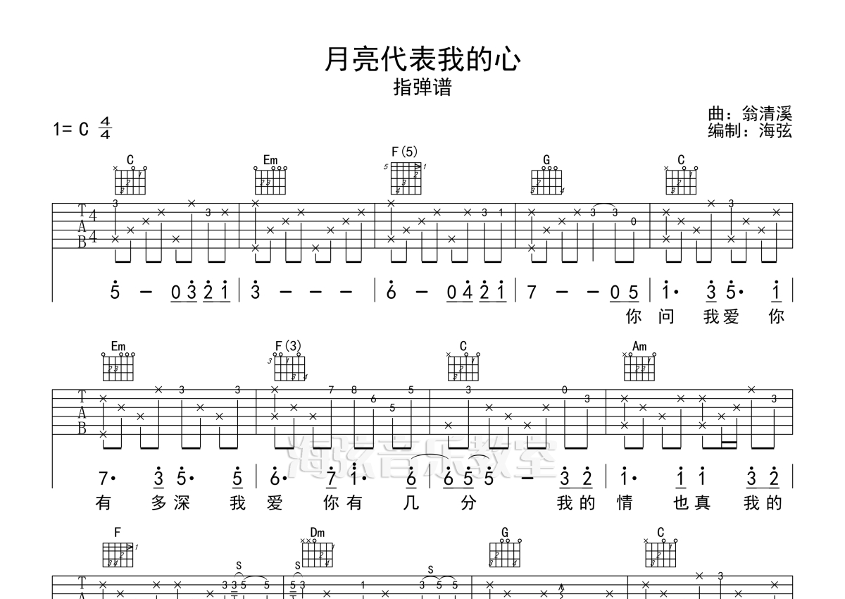 邓丽君《月亮代表我的心》吉他谱 - C调独奏六线谱