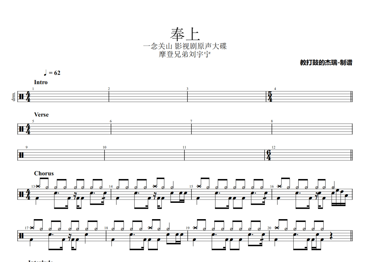 《奉上》是摩登兄弟刘宇宁演唱的一首歌曲,一念关山 影视剧原声大碟,拍号为4/4拍,歌曲速度为每分钟62拍,这份鼓谱共有两张高清图谱,图谱由 @Jerry 编配上传,图谱使用五线谱编配,使用这份奉上架子鼓谱,你将能够轻松地敲打出这首摩登兄弟刘宇宁的奉上,快来尝试吧。
