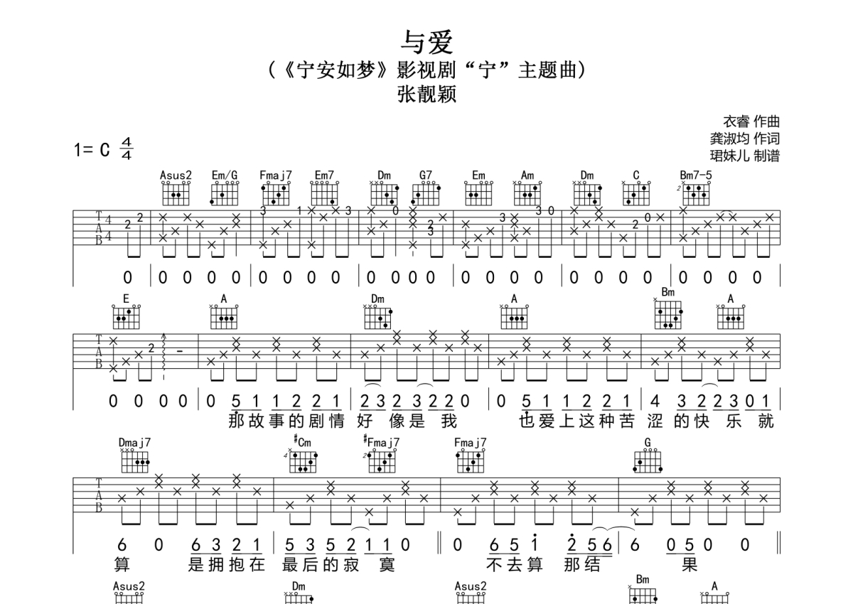 张靓颖《与爱》吉他谱 - C调弹唱六线谱