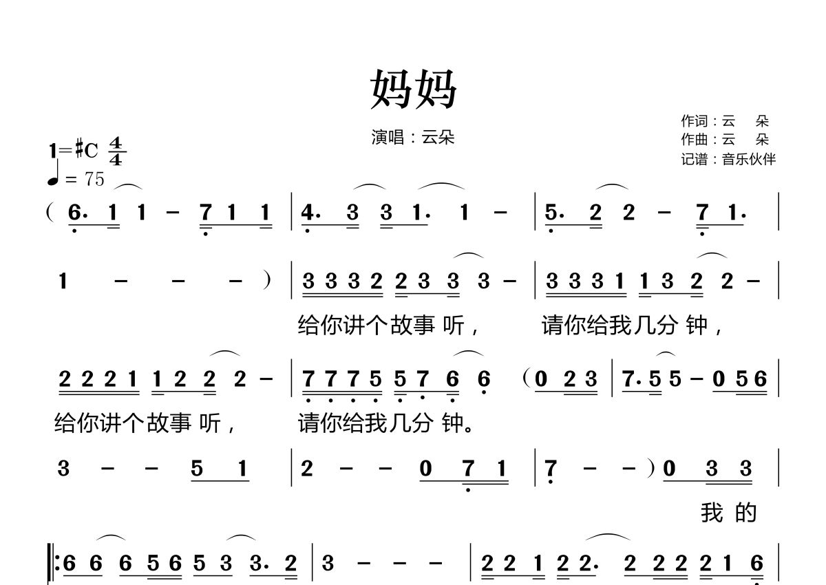 《妈妈》是云朵演唱的一首歌曲,这份简谱共有两张高清图谱,图谱由 @音乐伙伴 编配上传。