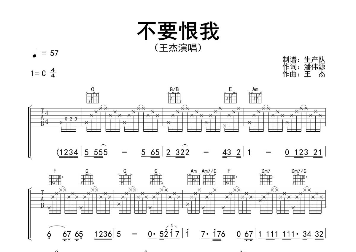 《不要恨我》是王杰演唱的一首歌曲,精编完美版,拍号为4/4拍,歌曲速度为每分钟57拍,歌曲原调为C调,本吉他谱采用的是C调指法编配,演奏时不需要使用变调夹即为原调,这份吉他谱共有三张高清图谱,图谱由 @生产队 编配上传,图谱使用六线谱编配,包含吉他和弦指法、简谱以及歌词部分,使用这份不要恨我吉他谱,可以让你更加方便地掌握这首歌曲的弹唱技巧,快来尝试吧。《不要恨我》是一首由潘伟源作词,由王杰作曲,并演唱的粤语歌曲,收录在专辑《封锁我一生》中。本吉他谱根据原版C调指法编配,完整的前奏、间奏、尾奏编配,怀旧粤语经典!。