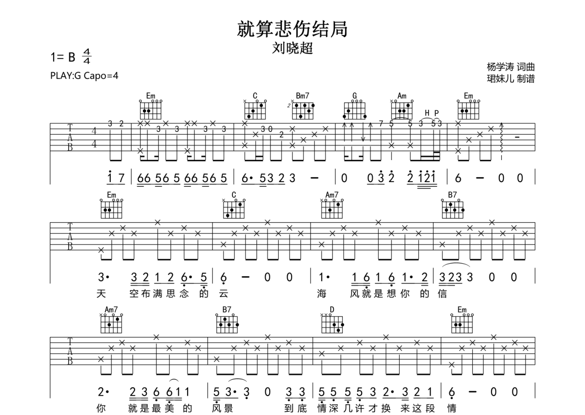 《就算悲伤结局》是刘晓超演唱的一首歌曲,拍号为4/4拍,歌曲速度为每分钟85拍,歌曲原调为B调,但由于原调指法比较难,为了方便弹奏,本吉他谱采用的是G调指法编配,变调夹4品弹奏即为原调,当然也可以根据自己的音域改变变调夹位置,或者通过改变和弦调性,以方便自己弹奏,这份吉他谱共有两张高清图谱,图谱由 @珺妹儿 编配上传,图谱使用六线谱编配,包含吉他和弦指法、简谱以及歌词部分,使用这份就算悲伤结局吉他谱,可以让你更加方便地掌握这首歌曲的弹唱技巧,快来尝试吧。