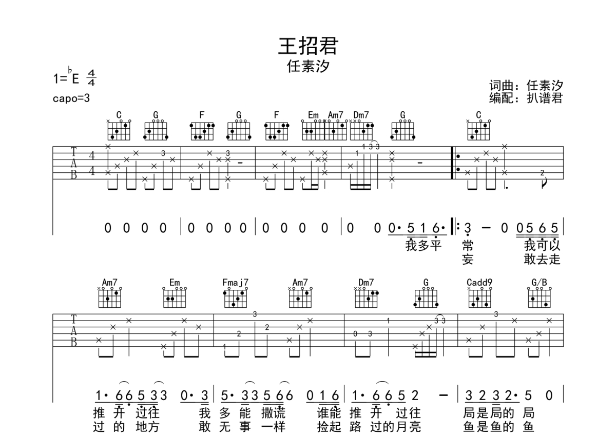 《王招君》是任素汐演唱的一首歌曲,拍号为4/4拍,歌曲原调为Eb调,但由于原调指法比较难,为了方便弹奏,本吉他谱采用的是C调指法编配,变调夹3品弹奏即为原调,当然也可以根据自己的音域改变变调夹位置,或者通过改变和弦调性,以方便自己弹奏,这份吉他谱共有三张高清图谱,图谱由 @扒谱君 编配上传,图谱使用六线谱编配,包含吉他和弦指法、简谱以及歌词部分,使用这份王招君吉他谱,可以让你更加方便地掌握这首歌曲的弹唱技巧,快来尝试吧。