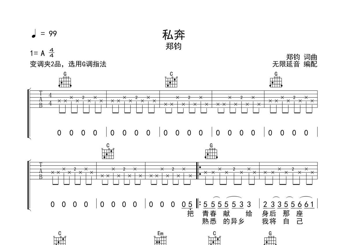 郑钧《私奔》吉他谱 - G调弹唱六线谱