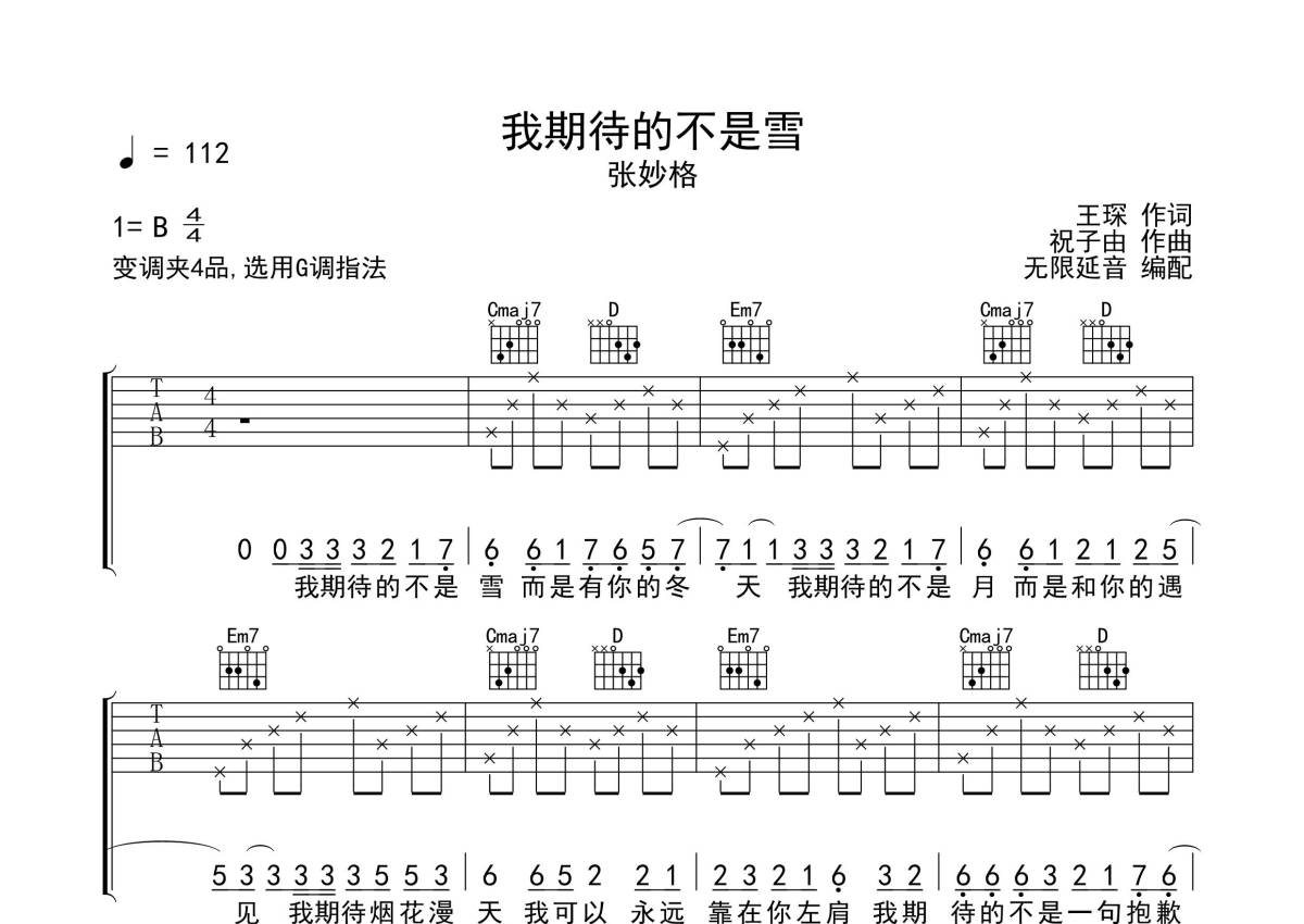 《我期待的不是雪》是张妙格演唱的一首歌曲,拍号为4/4拍,歌曲速度为每分钟112拍,歌曲原调为B调,但由于原调指法比较难,为了方便弹奏,本吉他谱采用的是G调指法编配,变调夹4品弹奏即为原调,当然也可以根据自己的音域改变变调夹位置,或者通过改变和弦调性,以方便自己弹奏,这份吉他谱共有三张高清图谱,图谱由 @无限延音 编配上传,图谱使用六线谱编配,包含吉他和弦指法、简谱以及歌词部分,使用这份我期待的不是雪吉他谱,可以让你更加方便地掌握这首歌曲的弹唱技巧,快来尝试吧。