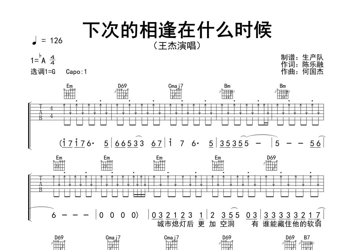 《下次的相逢在什么时候》是王杰演唱的一首歌曲,精编完美版,拍号为4/4拍,歌曲速度为每分钟126拍,歌曲原调为Ab调,但由于原调指法比较难,为了方便弹奏,本吉他谱采用的是G调指法编配,变调夹1品弹奏即为原调,当然也可以根据自己的音域改变变调夹位置,或者通过改变和弦调性,以方便自己弹奏,这份吉他谱共有两张高清图谱,图谱由 @生产队 编配上传,图谱使用六线谱编配,包含吉他和弦指法、简谱以及歌词部分,使用这份下次的相逢在什么时候吉他谱,可以让你更加方便地掌握这首歌曲的弹唱技巧,快来尝试吧。《下次的相逢在什么时候》是由王杰演唱的经典歌曲,陈乐融作词,何国杰作曲,收录在专辑《英雄泪》中。本吉他谱根据原版G调指法编配,完整的前奏、间奏、尾奏及SOLO,本曲动感十足,采用扫弦切音节奏编配,怀旧经典!。
