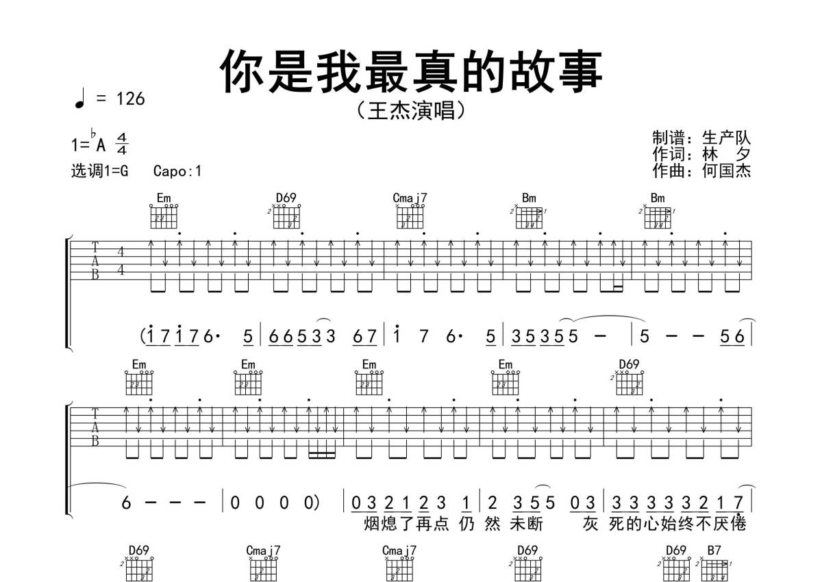 《你是我最真的故事》是王杰演唱的一首歌曲,精编完美版,拍号为4/4拍,歌曲速度为每分钟126拍,歌曲原调为Ab调,但由于原调指法比较难,为了方便弹奏,本吉他谱采用的是G调指法编配,变调夹1品弹奏即为原调,当然也可以根据自己的音域改变变调夹位置,或者通过改变和弦调性,以方便自己弹奏,这份吉他谱共有两张高清图谱,图谱由 @生产队 编配上传,图谱使用六线谱编配,包含吉他和弦指法、简谱以及歌词部分,使用这份你是我最真的故事吉他谱,可以让你更加方便地掌握这首歌曲的弹唱技巧,快来尝试吧。《你是我最真的故事》是由林夕作词,何国杰作曲、编曲,王杰演唱的粤语歌曲,收录在专辑《封锁我一生》中。本吉他谱根据原版G调指法编配,完整的前奏、间奏、尾奏及SOLO,本曲动感十足,采用扫弦切音节奏编配,怀旧经典!。