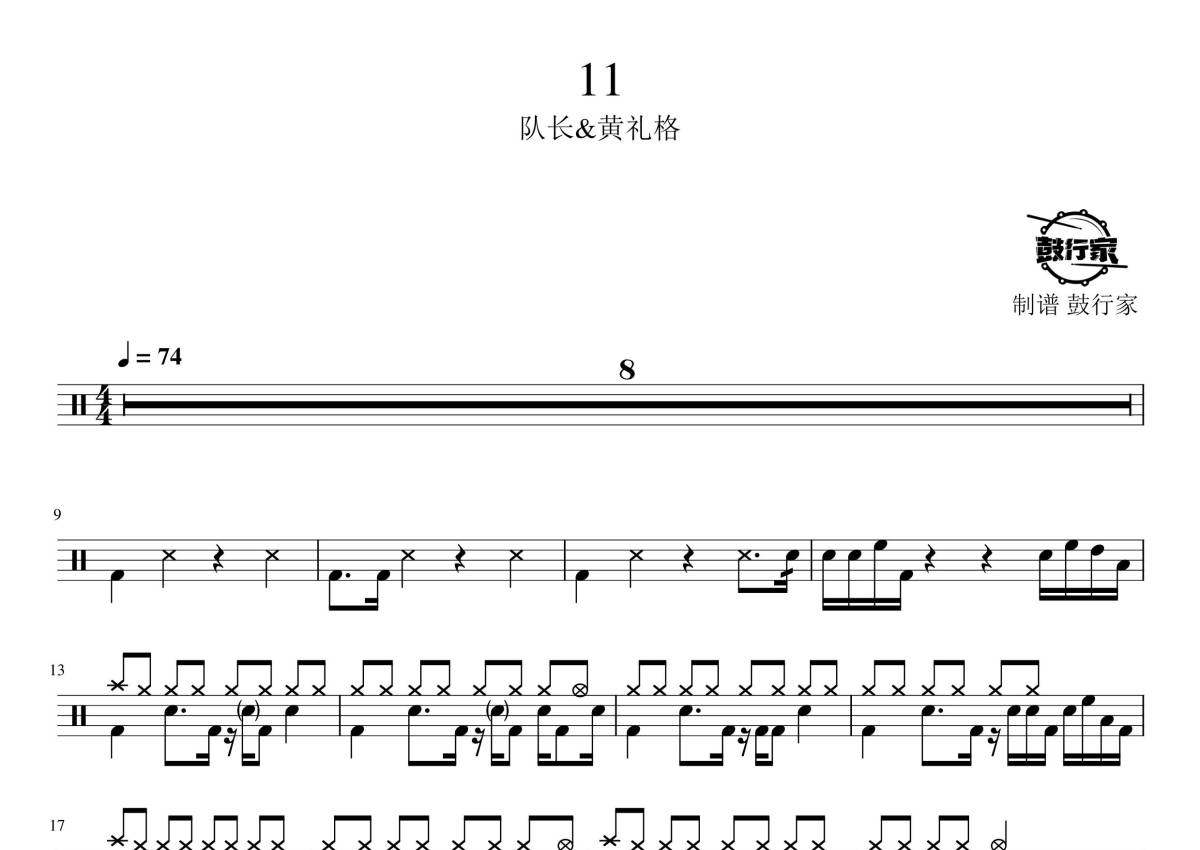 《11》是队长/黄礼格演唱的一首歌曲,拍号为4/4拍,歌曲速度为每分钟74拍,这份鼓谱共有两张高清图谱,图谱由 @鼓行家 编配上传,图谱使用五线谱编配,使用这份11架子鼓谱,你将能够轻松地敲打出这首队长/黄礼格的11,快来尝试吧。