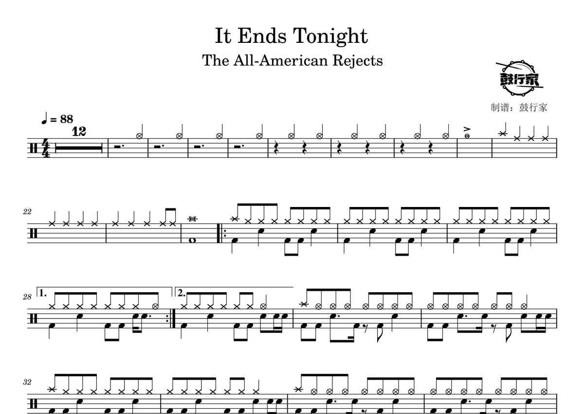 The All-American Rejects《It Ends Tonight》鼓谱 - 架子鼓谱