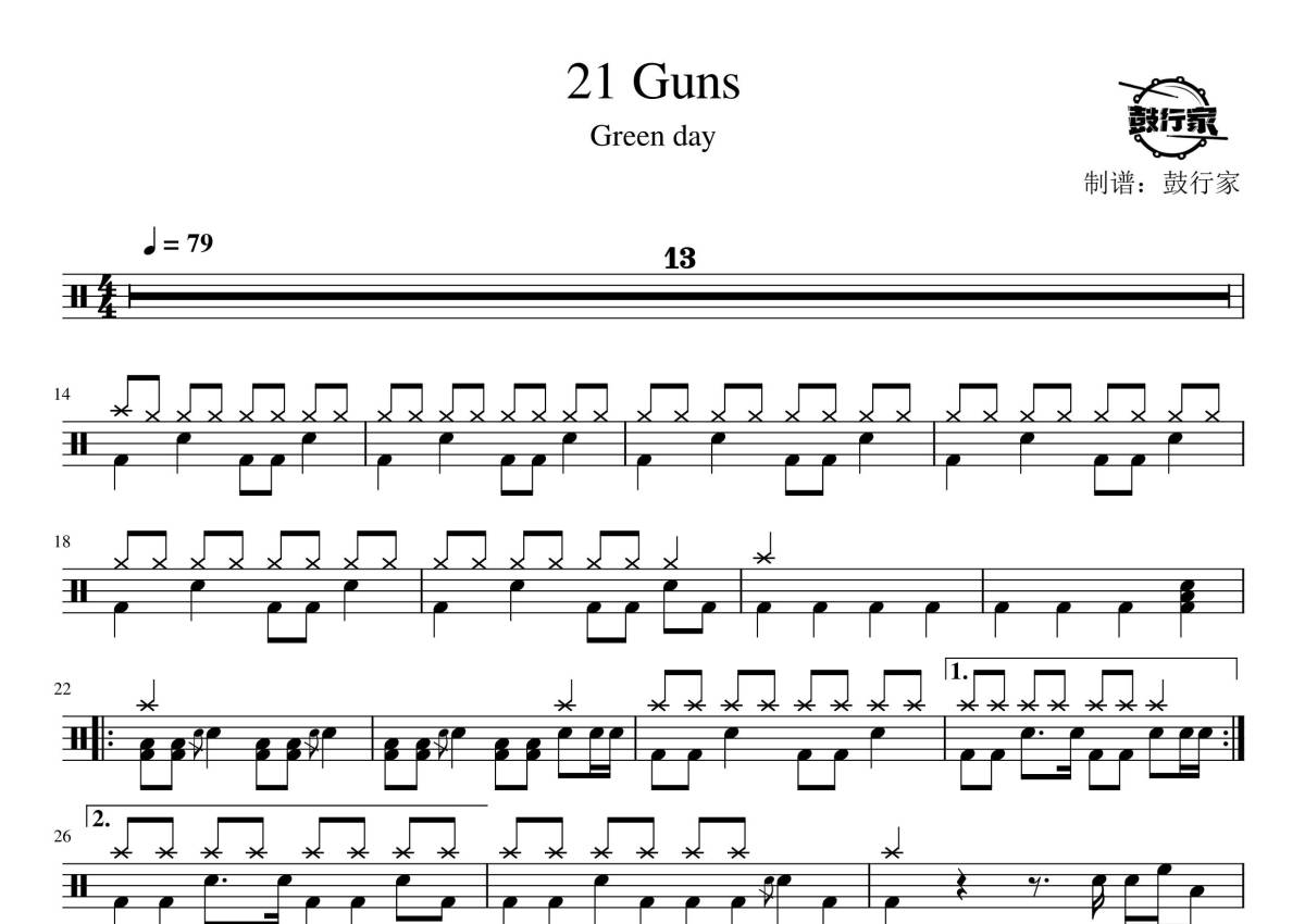 《21 Guns》是Green Day演唱的一首歌曲,拍号为4/4拍,歌曲速度为每分钟79拍,这份鼓谱共有两张高清图谱,图谱由 @鼓行家 编配上传,图谱使用五线谱编配,使用这份21 Guns架子鼓谱,你将能够轻松地敲打出这首Green Day的21 Guns,快来尝试吧。