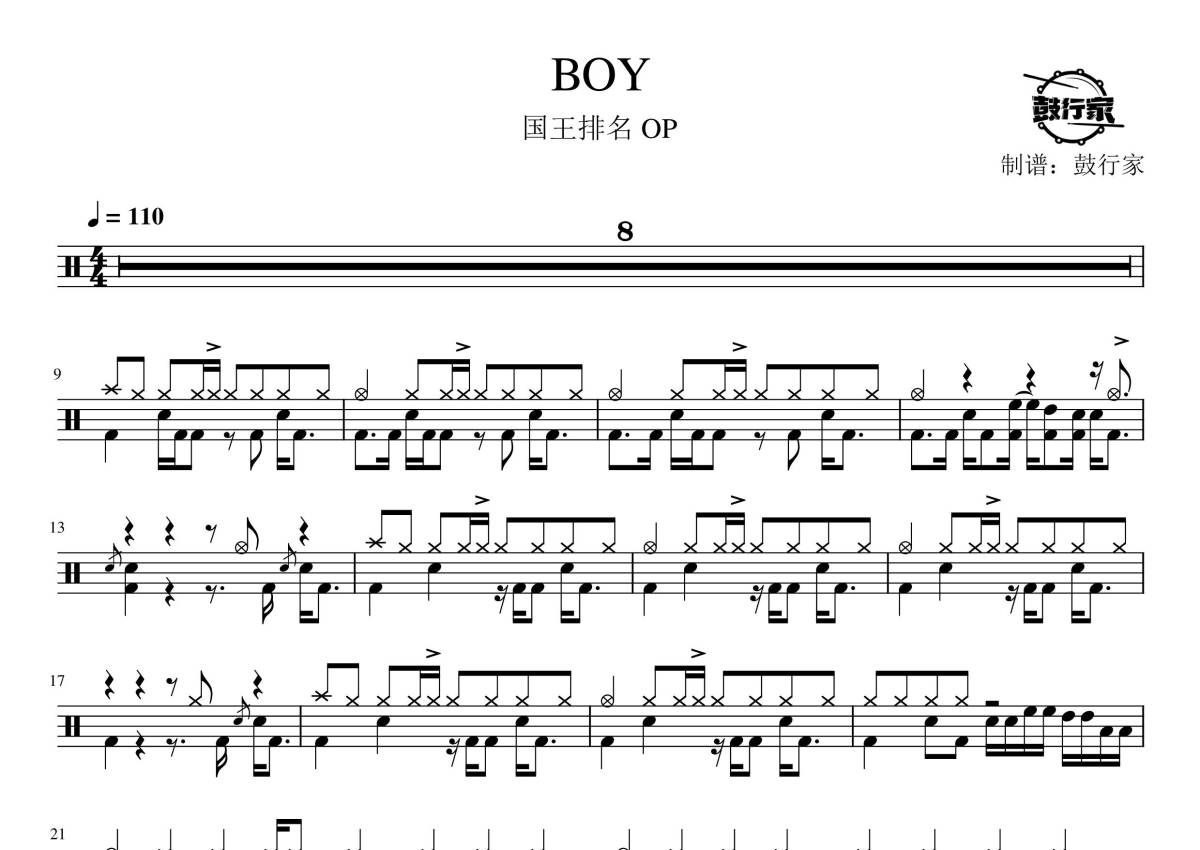 国王排名OP《BOY》鼓谱 - 架子鼓谱