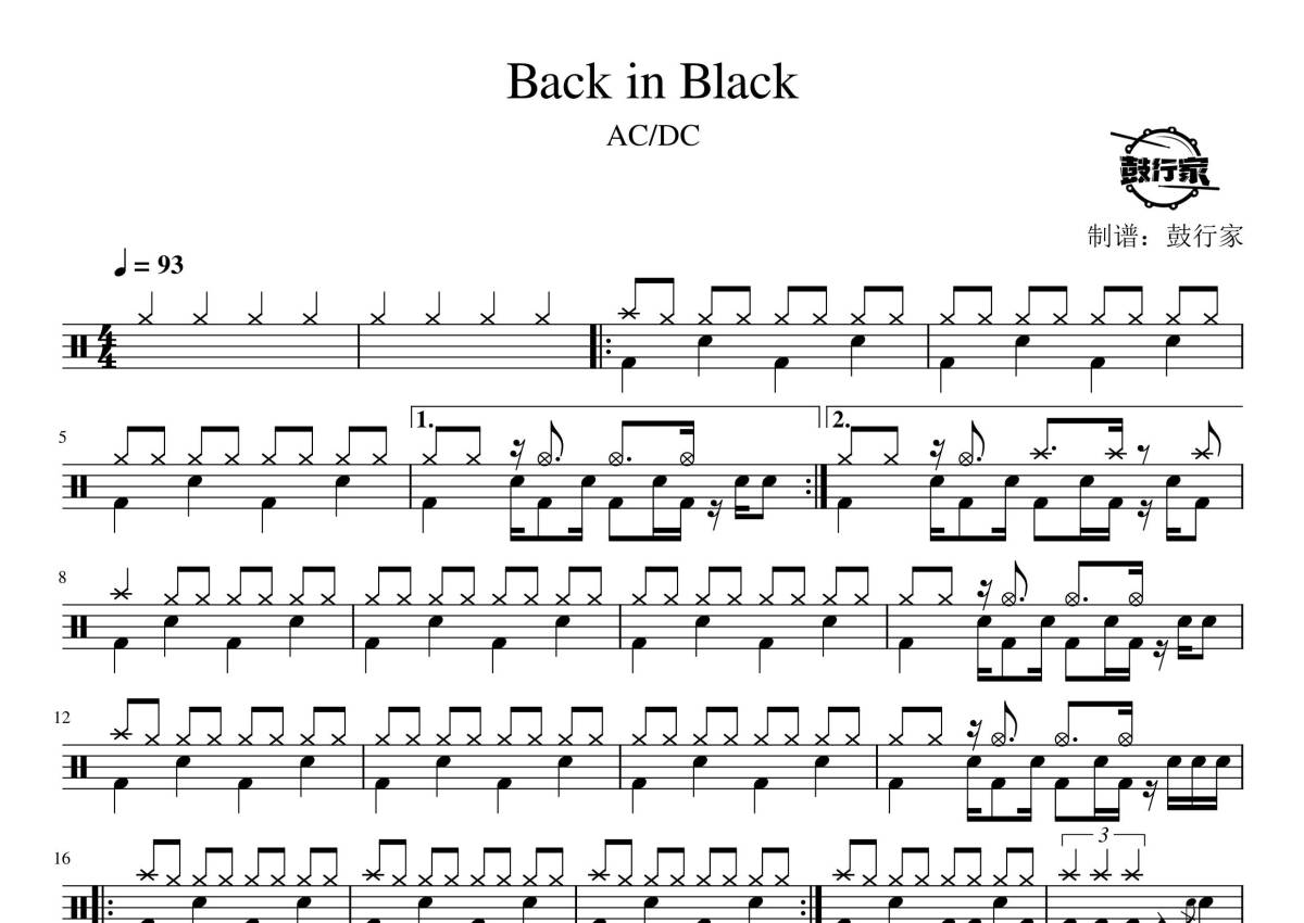 《Back in Black》是AC/DC演唱的一首歌曲,拍号为4/4拍,歌曲速度为每分钟93拍,这份鼓谱共有两张高清图谱,图谱由 @鼓行家 编配上传,图谱使用五线谱编配,使用这份Back in Black架子鼓谱,你将能够轻松地敲打出这首AC/DC的Back in Black,快来尝试吧。