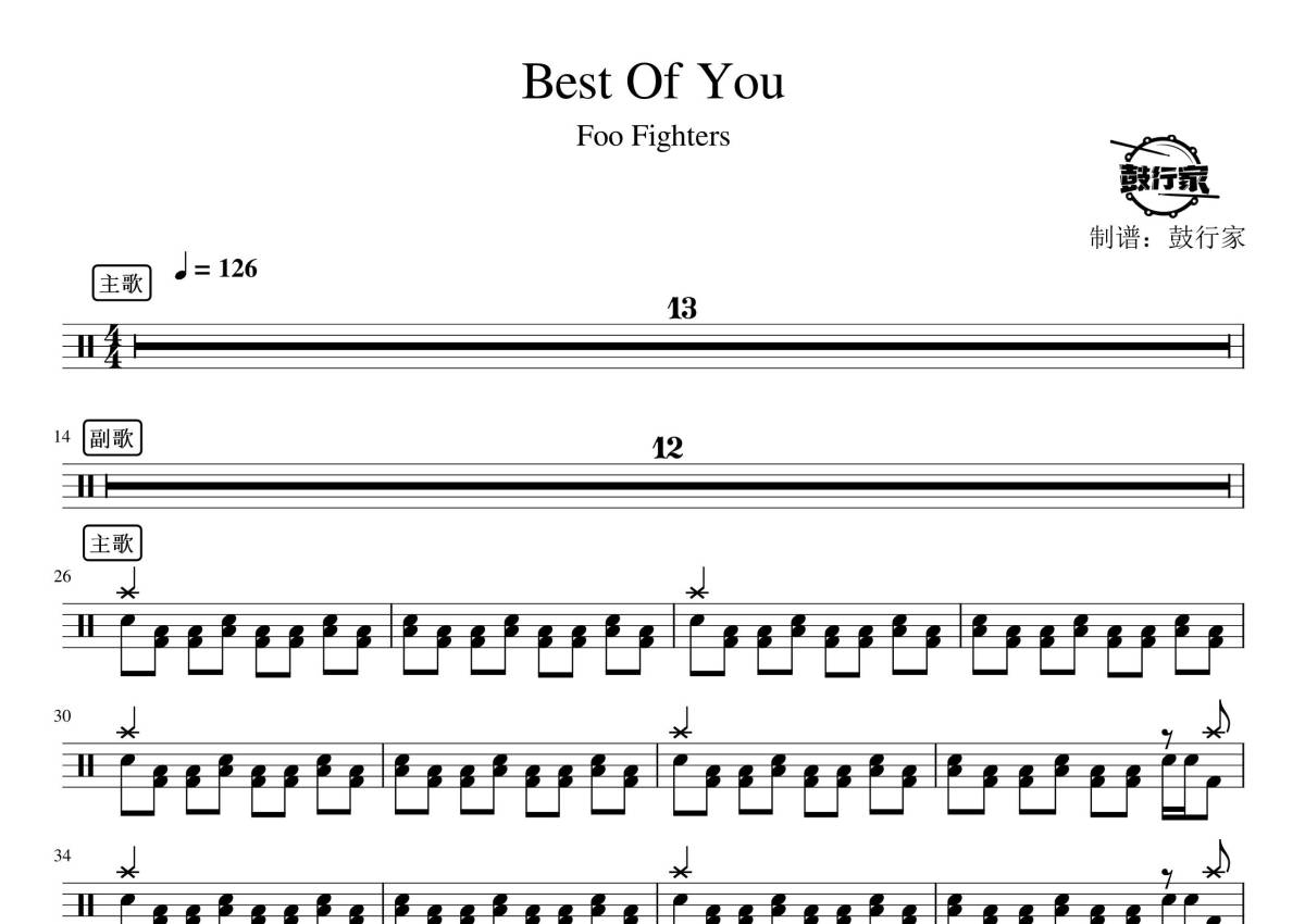 《Best Of You》是Foo Fighters演唱的一首歌曲,拍号为4/4拍,歌曲速度为每分钟126拍,这份鼓谱共有三张高清图谱,图谱由 @鼓行家 编配上传,图谱使用五线谱编配,使用这份Best Of You架子鼓谱,你将能够轻松地敲打出这首Foo Fighters的Best Of You,快来尝试吧。