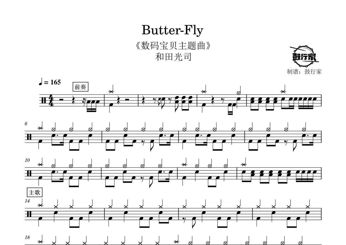 《Butter-Fly》是数码宝贝OP演唱的一首歌曲,拍号为4/4拍,歌曲速度为每分钟165拍,这份鼓谱共有四张高清图谱,图谱由 @鼓行家 编配上传,图谱使用五线谱编配,使用这份Butter-Fly架子鼓谱,你将能够轻松地敲打出这首数码宝贝OP的Butter-Fly,快来尝试吧。