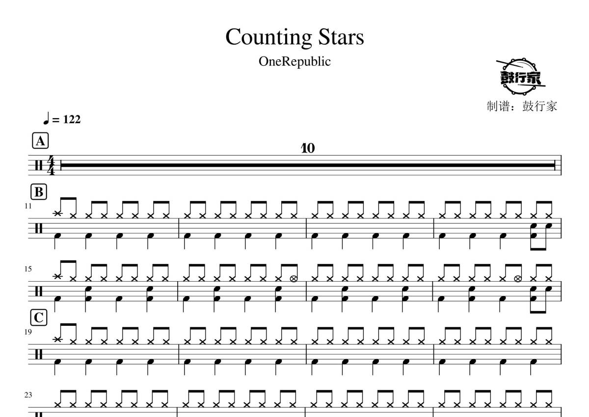 《COUNTING STARS》是OneRepublic演唱的一首歌曲,拍号为4/4拍,歌曲速度为每分钟122拍,这份鼓谱共有三张高清图谱,图谱由 @鼓行家 编配上传,图谱使用五线谱编配,使用这份COUNTING STARS架子鼓谱,你将能够轻松地敲打出这首OneRepublic的COUNTING STARS,快来尝试吧。