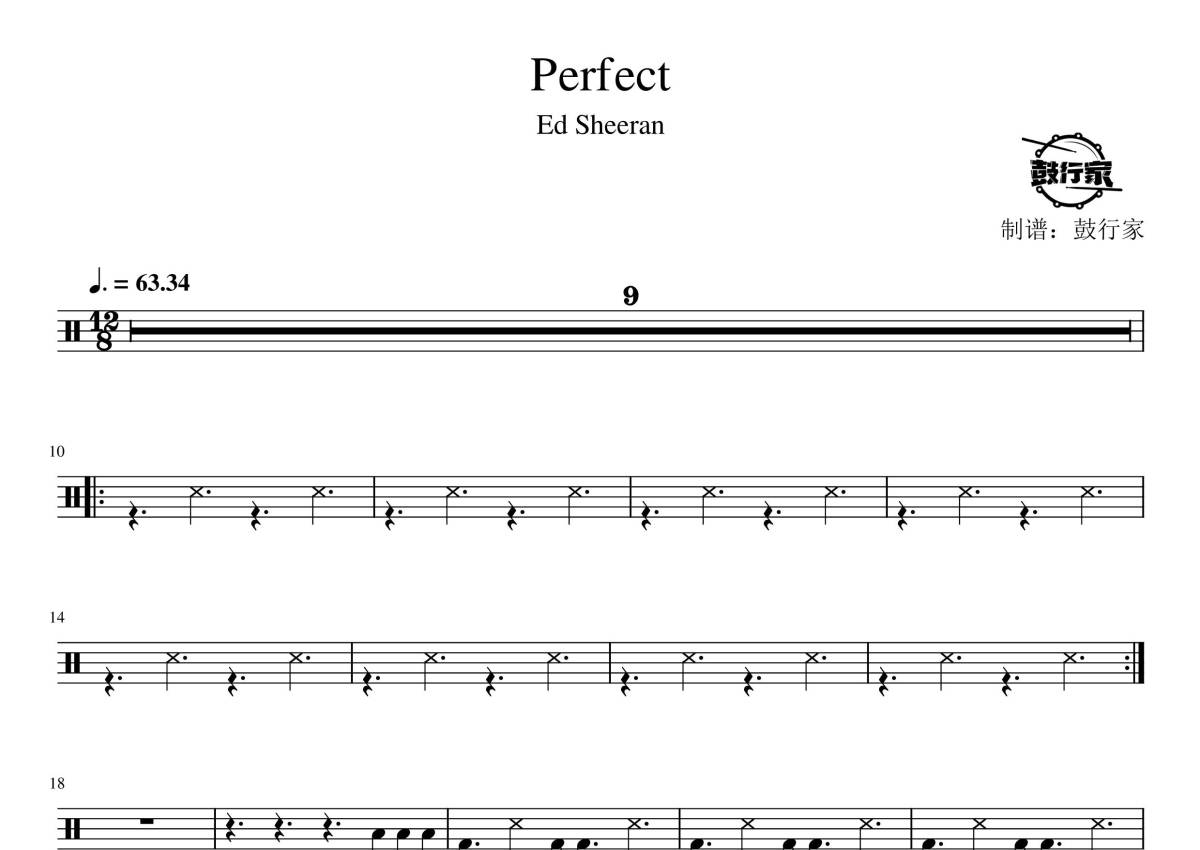 《Perfect》是Ed Sheeran演唱的一首歌曲,拍号为4/4拍,歌曲速度为每分钟63拍,这份鼓谱共有两张高清图谱,图谱由 @鼓行家 编配上传,图谱使用五线谱编配,使用这份Perfect架子鼓谱,你将能够轻松地敲打出这首Ed Sheeran的Perfect,快来尝试吧。