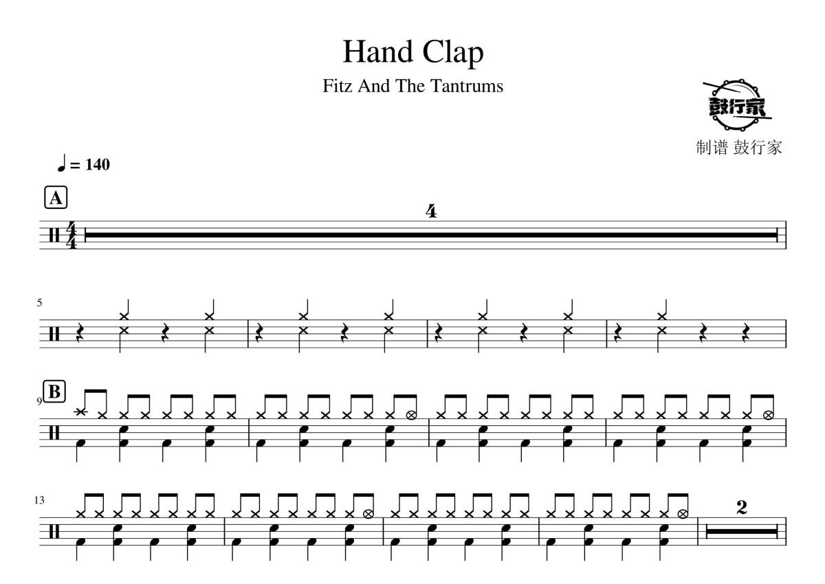 《Hand Clap》是Fitz And The Tantrums演唱的一首歌曲,拍号为4/4拍,歌曲速度为每分钟140拍,这份鼓谱共有两张高清图谱,图谱由 @鼓行家 编配上传,图谱使用五线谱编配,使用这份Hand Clap架子鼓谱,你将能够轻松地敲打出这首Fitz And The Tantrums的Hand Clap,快来尝试吧。