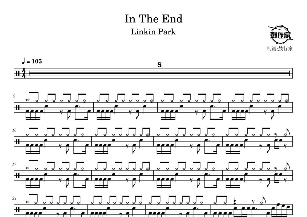 《In The End》是Linkin Park演唱的一首歌曲,拍号为4/4拍,歌曲速度为每分钟105拍,这份鼓谱共有两张高清图谱,图谱由 @鼓行家 编配上传,图谱使用五线谱编配,使用这份In The End架子鼓谱,你将能够轻松地敲打出这首Linkin Park的In The End,快来尝试吧。