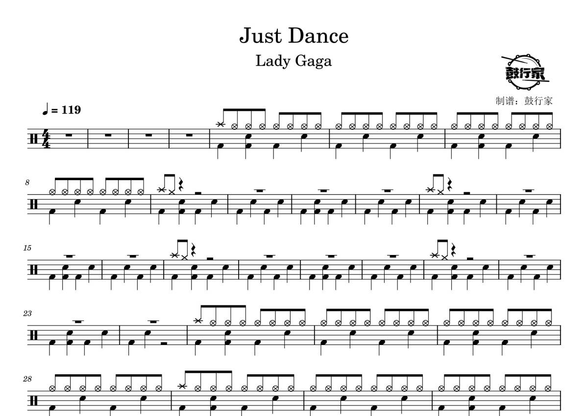 《Just Dance》是Lady Gaga演唱的一首歌曲,拍号为4/4拍,歌曲速度为每分钟119拍,这份鼓谱共有两张高清图谱,图谱由 @鼓行家 编配上传,图谱使用五线谱编配,使用这份Just Dance架子鼓谱,你将能够轻松地敲打出这首Lady Gaga的Just Dance,快来尝试吧。