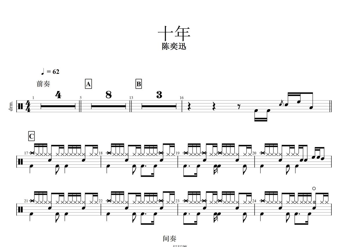 《十年》是陈奕迅演唱的一首歌曲,这份鼓谱共有两张高清图谱,图谱由 @打鼓谱 编配上传,图谱使用五线谱编配,使用这份十年架子鼓谱,你将能够轻松地敲打出这首陈奕迅的十年,快来尝试吧。《十年》是陈奕迅演唱的一首歌曲,由林夕作词,陈小霞作曲,陈辉阳编曲,收录在陈奕迅2003年4月15日由英皇唱片发行的专辑《黑·白·灰》中 [1] 。