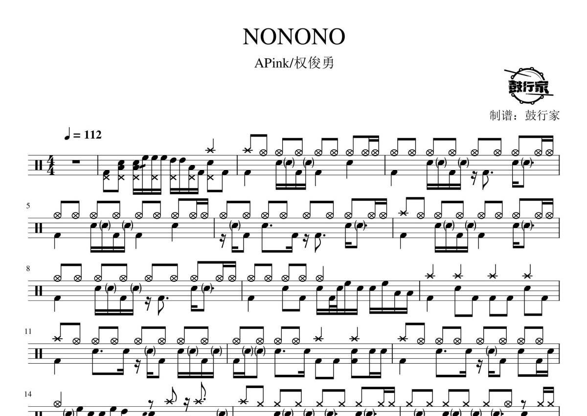 《NONONO》是APink/权俊勇演唱的一首歌曲,拍号为4/4拍,歌曲速度为每分钟112拍,这份鼓谱共有三张高清图谱,图谱由 @鼓行家 编配上传,图谱使用五线谱编配,使用这份NONONO架子鼓谱,你将能够轻松地敲打出这首APink/权俊勇的NONONO,快来尝试吧。