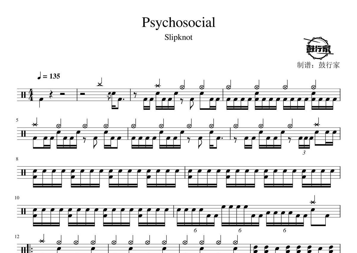 《Psychosocial》是Slipknot演唱的一首歌曲,拍号为4/4拍,歌曲速度为每分钟135拍,这份鼓谱共有三张高清图谱,图谱由 @鼓行家 编配上传,图谱使用五线谱编配,使用这份Psychosocial架子鼓谱,你将能够轻松地敲打出这首Slipknot的Psychosocial,快来尝试吧。