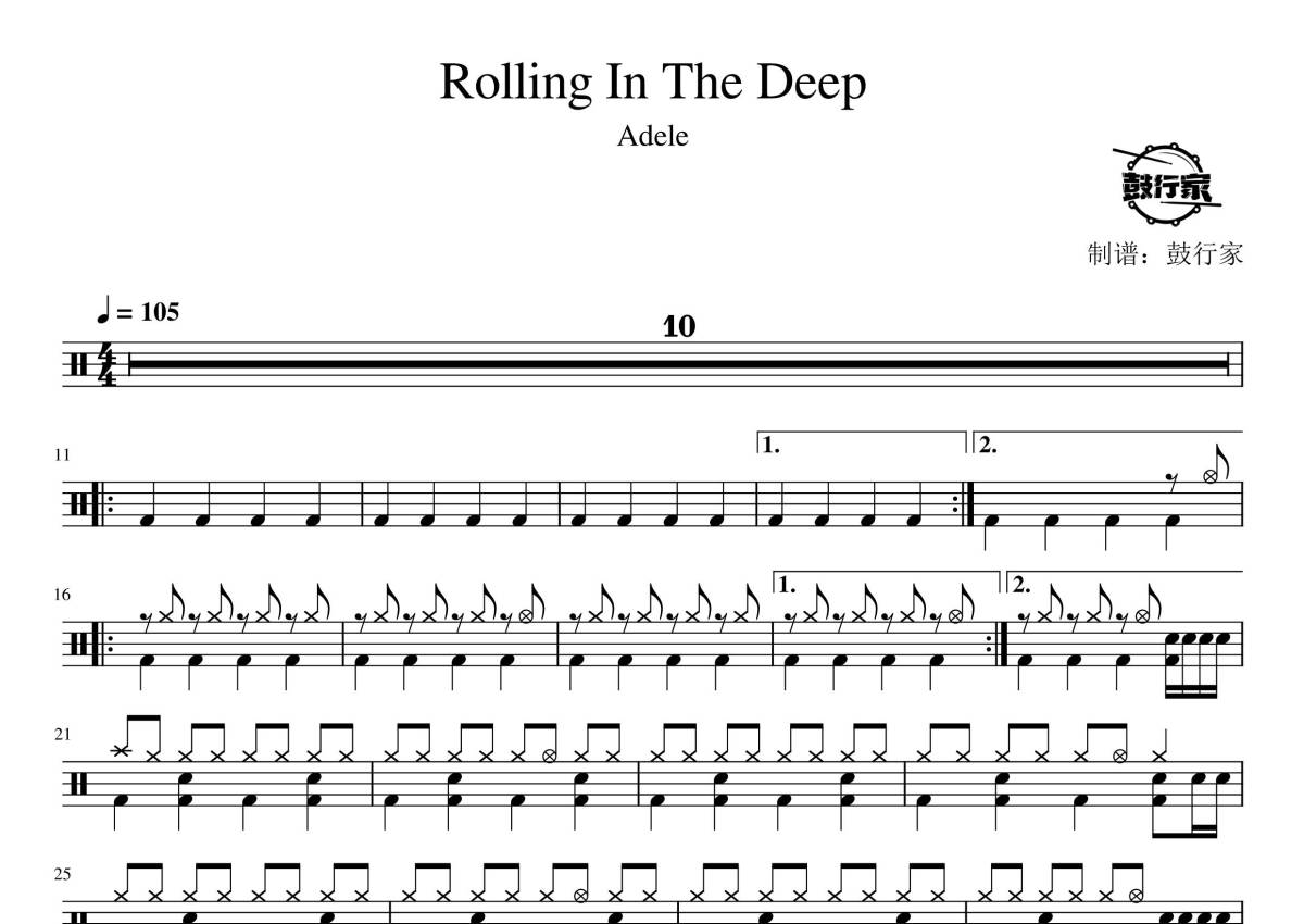 《Rolling In The Deep》是Adele演唱的一首歌曲,拍号为4/4拍,歌曲速度为每分钟105拍,这份鼓谱共有两张高清图谱,图谱由 @鼓行家 编配上传,图谱使用五线谱编配,使用这份Rolling In The Deep架子鼓谱,你将能够轻松地敲打出这首Adele的Rolling In The Deep,快来尝试吧。