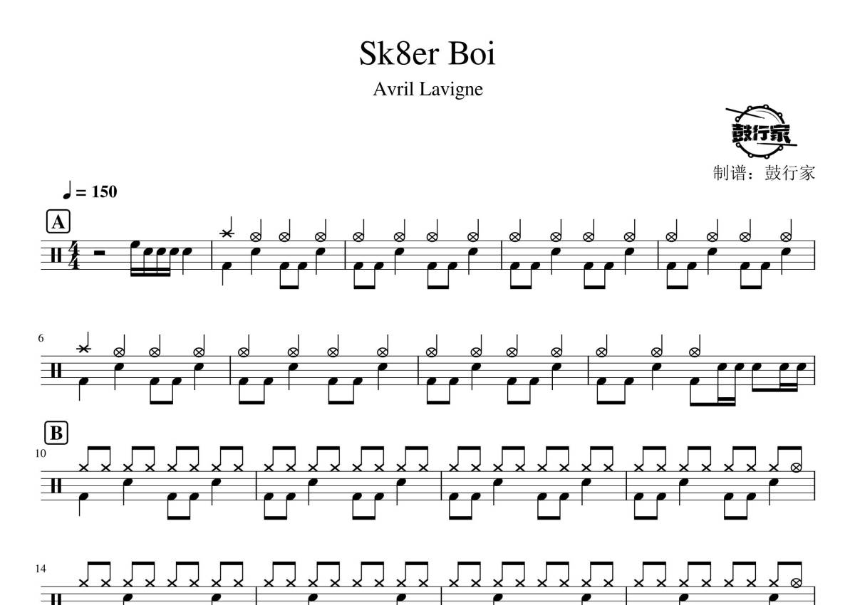 《Sk8er Boi》是Avril Lavigne演唱的一首歌曲,拍号为4/4拍,歌曲速度为每分钟150拍,这份鼓谱共有三张高清图谱,图谱由 @鼓行家 编配上传,图谱使用五线谱编配,使用这份Sk8er Boi架子鼓谱,你将能够轻松地敲打出这首Avril Lavigne的Sk8er Boi,快来尝试吧。