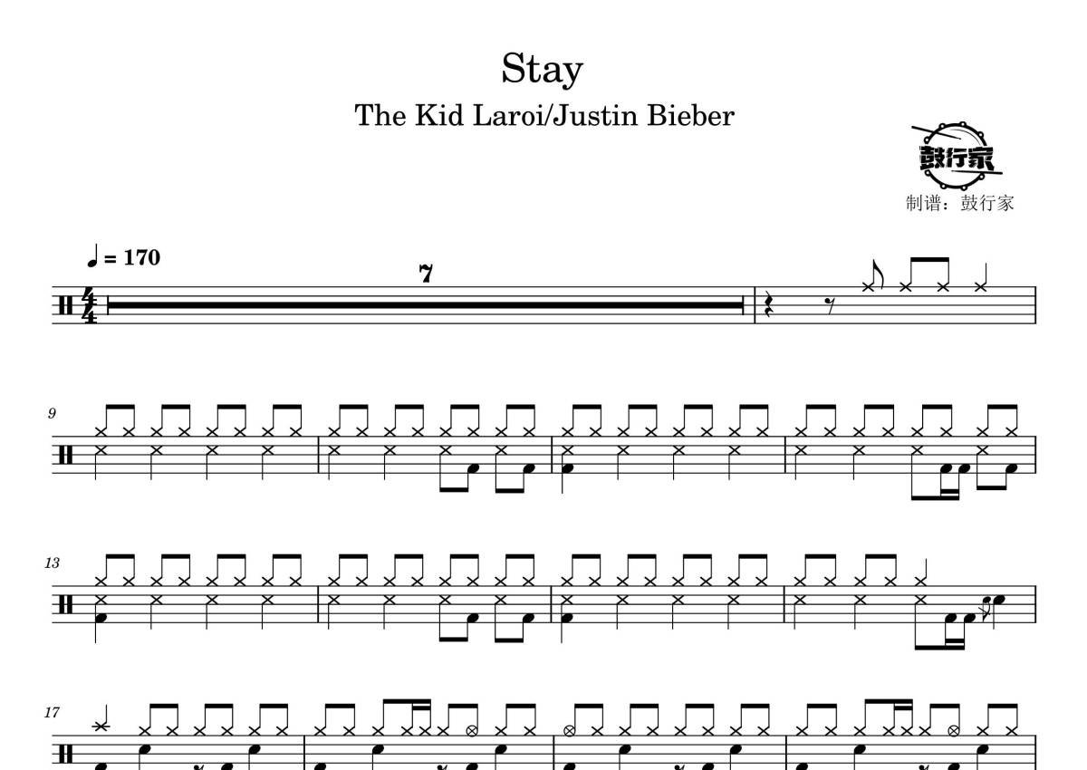 《Stay》是The Kid Laroi/Justin Bieber演唱的一首歌曲,拍号为4/4拍,歌曲速度为每分钟170拍,这份鼓谱共有三张高清图谱,图谱由 @鼓行家 编配上传,图谱使用五线谱编配,使用这份Stay架子鼓谱,你将能够轻松地敲打出这首The Kid Laroi/Justin Bieber的Stay,快来尝试吧。