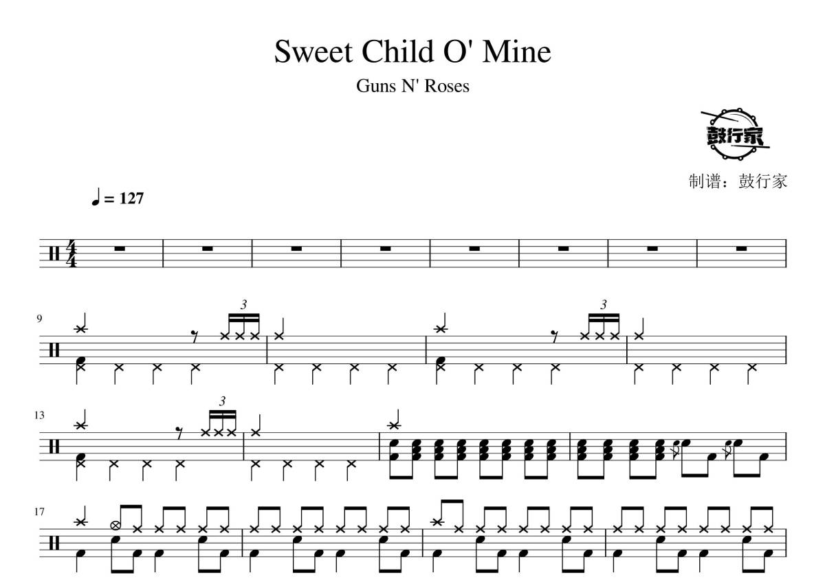 《Sweet Child O' Mine》是Guns N' Roses演唱的一首歌曲,拍号为4/4拍,歌曲速度为每分钟127拍,这份鼓谱共有四张高清图谱,图谱由 @鼓行家 编配上传,图谱使用五线谱编配,使用这份Sweet Child O' Mine架子鼓谱,你将能够轻松地敲打出这首Guns N' Roses的Sweet Child O' Mine,快来尝试吧。